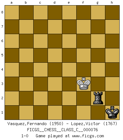 Last move : 1-0 2009 December 30 20:17:39 [Event "FICGS__CHESS__CLASS_C__000076"] [Site "FICGS"] [Date "2008.03.20"] [Round "1"] [White "Vasquez,Fernando"] [Black "Lopez,Victor"] [Result "1-0"] [WhiteElo "1950"] [BlackElo "1767"] 1.e4 c5 2.d4 cxd4 3.c3 dxc3 4.Nxc3 Nc6 5.Nf3 e6 6.Bc4 d6 7.O-O Nf6 8.Qe2 Be7 9.Rd1 e5 10.a3 O-O 11.Be3 Be6 12.Bxe6 fxe6 13.h3 Rc8 14.Rac1 a6 15.b4 Qd7 16.Na4 Bd8 17.Qd3 Bc7 18.b5 axb5 19.Qxb5 Qe8 20.Qxb7 Na5 21.Qb4 Nc6 22.Qb5 Na5 23.Nc3 Bd8 24.Nd2 Rc6 25.a4 Rf7 26.Qd3 Rfc7 27.Ndb1 Nb3 28.Rc2 Nc5 29.Bxc5 Rxc5 30.Qxd6 Rc8 31.Qd3 Ba5 32.Rdc1 Qc6 33.f3 Kf7 34.Kh2 h6 35.Qd1 Bb4 36.Qd3 Ba5 37.h4 Nh5 38.g3 Nf6 39.Kh3 Bb4 40.Qe3 Kg8 41.Qd3 Kh7 42.Qd2 Rc7 43.Qd3 Kg6 44.Qd1 Qd7 45.Qe2 Qc8 46.Qe3 Nd7 47.Qd3 Ba5 48.Rd1 Rc4 49.Qe2 Nf6 50.Rdc1 Kh7 51.h5 Nxh5 52.Kg2 Bxc3 53.Na3 Nxg3 54.Kxg3 Rxa4 55.Nb5 Be1+ 56.Kg4 Qe8 57.Qxe1 Rxc2 58.Rxc2 Qxb5 59.Qc3 Rb4 60.Qc6 Qd3 61.Qc3 Qxc3 62.Rxc3 Kg6 63.Rc6 Kf6 64.Rc8 Rb1 65.Rf8+ Kg6 66.Kh4 Rh1+ 67.Kg3 Kg5 68.Rg8 g6 69.Re8 Kf6 70.Rf8+ Ke7 71.Rb8 h5 72.Rg8 Kf7 73.Rb8 g5 74.Kg2 Ra1 75.Kf2 Ra2+ 76.Ke3 h4 77.Rh8 Kg7 78.Rh5 Rg2 79.Kd3 Rg3 80.Ke2 Kg6 81.Rh8 g4 82.fxg4 Kg5 83.Re8 Kxg4 84.Rxe6 h3 85.Rg6+ Kf4 86.Rh6 Rg2+ 87.Kf1 Kg3 88.Rg6+ Kh2 89.Rf6 Rg4 90.Rf2+ Kh1 91.Rf3 Rh4 92.Kf2 Kh2 93.Rf5 Rxe4 94.Rg5 Rf4+ 95.Ke3 Ra4 96.Rg8 e4 97.Rg6 Kh1 98.Kf2 Ra2+ 99.Ke3 Rg2 100.Rb6 Rg3+ 101.Kf4 Rf3+ 102.Kxe4 Kg2 103.Rb2+ Rf2 104.Rb6 h2 105.Rg6+ Kf1 106.Rh6 Kg1 107.Ke3 Rg2 108.Rc6 h1Q 109.Rc1+ Kh2 110.Rxh1+ Kxh1 111.Kf3 1-0 Sicilian : Smith-Morra gambit Kingside Castling by player White (move 7) Kingside Castling by player Black (move 10) 10 pieces endgame at move 62 : White KRPP , Black KRPPPP WHITE : King + 1 Rook 2 Pawns BLACK : King + 1 Rook 4 Pawns 9 pieces endgame at move 82 : White KRPP , Black KRPPP WHITE : King + 1 Rook 2 Pawns BLACK : King + 1 Rook 3 Pawns 8 pieces endgame at move 83 : White KRP , Black KRPPP WHITE : King + 1 Rook 1 Pawn BLACK : King + 1 Rook 3 Pawns 7 pieces endgame at move 84 : White KRP , Black KRPP WHITE : King + 1 Rook 1 Pawn BLACK : King + 1 Rook 2 Pawns 6 pieces endgame at move 93 : White KR , Black KRPP WHITE : King + 1 Rook BLACK : King + 1 Rook 2 Pawns 5 pieces endgame at move 102 : White KR , Black KRP WHITE : King + 1 Rook BLACK : King + 1 Rook 1 Pawn Promotion Queen by player Black (move 108) 4 pieces endgame at move 110 : White KR , Black KR WHITE : King + 1 Rook BLACK : King + 1 Rook 3 pieces endgame at move 110 : White K , Black KR WHITE : King + BLACK : King + 1 Rook Player White won this chess game. Follow this game move after move (download)Pawn endings are to Chess what putting is to golf. (Cecil Purdy) Lisa Lane, amerikanische Schachmeisterin, hatte Fischer einmal als stärksten lebenden Spieler bezeichnet. Antwort: Das ist richtig, aber Lisa Lane ist eigentlich nicht in der Lage, das zu beurteilen. (Robert James Fischer) De todos mis libros Rusos, la defensa contiene y difunde el 'calor' mas grande que pudiese verse extraño al observar lo supremamente abstracto que el Ajedrez supuestamente es. (Vladimir Nabokov) Un footballeur joue avec ses pieds, parfois avec sa tête. Un joueur d'échecs ne joue qu'avec sa tête. Et quand il ne joue plus, il meurt. (Jacob Murray) First of all, we have to go back to the classical time control. (Anatoly Karpov)