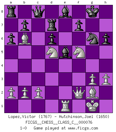 Last move : 1-0 2008 October 20 12:20:9 [Event "FICGS__CHESS__CLASS_C__000076"] [Site "FICGS"] [Date "2008.03.20"] [Round "1"] [White "Lopez,Victor"] [Black "Hutchinson,Joel"] [Result "1-0"] [WhiteElo "1767"] [BlackElo "1650"] 1.e4 c5 2.Nc3 Nc6 3.f4 d6 4.Nf3 g6 5.g3 Bg7 6.Bg2 a6 7.O-O Bg4 8.h3 Bd7 9.d3 e6 10.Be3 Nge7 11.d4 cxd4 12.Nxd4 O-O 13.Nb3 Qb8 14.Qd2 Rd8 15.Rad1 Be8 16.Bb6 Rd7 17.f5 exf5 18.exf5 Nxf5 19.Rxf5 gxf5 20.Nd5 h6 21.Re1 Ne5 22.Qf4 Qc8 23.Nd4 Ng6 24.Qf2 Be5 25.Nxf5 1-0 Sicilian : Grand Prix attack Kingside Castling by player White (move 7) Kingside Castling by player Black (move 12) Player White won this chess game. Follow this game move after move (download)The battle for the ultimate truth will never be won. And that's why Chess is so fascinating. (Hans Kmoch) Ich spiele 70 Eröffnungssysteme. (Viktor Kortschnoi) Una partida de Ajedrez se divide en 3 etapas: la primera cuando piensas que tienes la ventaja, la segunda cuando crees que tienes la ventaja y la tercera... ¡cuando te das cuenta que vas a perder!. (Savielly Tartakower) Botvinnik disait en comparant les échecs à la musique: Il existe une science dont le but est l'étude de l'acoustique et des sons. Mais il y a aussi un art qui se sert de l'océan des sons : c'est la musique. De toute évidence, il en est de même pour la pensée. La logique est l'étude des lois de la réflexion et les échecs reflètent, en tant qu'art, le côté logique de la réflexion, sous la forme d'images artistiques... Extrait de Fischer - Spassky, Reykjavik 1972 par Alexander & F. Wyndham (Ed. Solar), p 37. There are three kinds of lies: lies, damned lies and statistics. (Mark Twain)