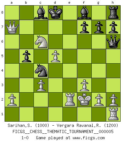 Last move : 1-0 2006 September 6 23:50:43 [Event "FICGS__CHESS__THEMATIC_TOURNAMENT__000005"] [Site "FICGS"] [Date "2006.07.09"] [Round "1"] [White "Sarihan,Sefa"] [Black "Vergara Ravanal,Raul Andres"] [Result "1-0"] [WhiteElo "1000"] [BlackElo "1200"] 1.e4 e5 2.d4 exd4 3.c3 c5 4.cxd4 Nc6 5.d5 Nd4 6.Nc3 d6 7.Be3 Qb6 8.Bxd4 cxd4 9.Bb5+ Kd8 10.Qe2 dxc3 11.bxc3 Qc5 12.Qc4 Qa3 13.Ne2 a6 14.Ba4 b5 15.Qc6 Qxa4 16.Qxa8 Qc2 17.f3 Nf6 18.Qc6 Nd7 19.Kf2 Nc5 20.Kf1 Bd7 21.Qb6+ Ke7 22.e5 Nd3 23.Qxd6+ Kd8 24.Qxa6 Nxe5 25.Re1 Nc4 26.Qa8+ Bc8 27.Qa7 Qg6 28.Nd4 Qd3+ 29.Kf2 Qd2+ 30.Re2 Qh6 31.Nc6+ 1-0 Danish gambit Player White won this chess game. Follow this game move after move (download)To avoid losing a piece, many a person has lost the game. (Savielly Tartakover) Auf Remis zu spielen ist gewissermaßen ein Verbrechen gegen das Schachspiel. (Mikhail Nekhemyevich Tal) Muchos se han convertido en Maestros de Ajedrez, nadie se ha convertido en el Maestro del Ajedrez. (Siegbert Tarrasch) Horreur, mais aussi harmonie suprême : qu'y avait-il en effet au monde en dehors des échecs ? Le brouillard, l'inconnu, le non-être... (Vladimir Nabokov) It's not enough to succeed. Others must fail. (Gore Vidal)