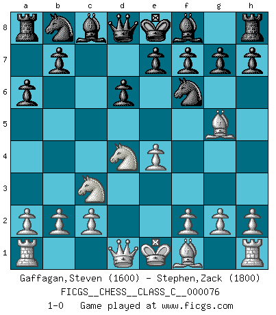 Last move : 1-0 2008 May 27 22:51:13 [Event "FICGS__CHESS__CLASS_C__000076"] [Site "FICGS"] [Date "2008.03.20"] [Round "1"] [White "Gaffagan,Steven"] [Black "Stephen,Zack"] [Result "1-0"] [WhiteElo "1600"] [BlackElo "1800"] 1.e4 c5 2.Nf3 d6 3.d4 cxd4 4.Nxd4 Nf6 5.Nc3 a6 6.Bg5 1-0 This chess game has been lost on time (started : 2008.03.20 17:55:31) Sicilian : Najdorf, 6.Bg5 Player White won this chess game. Follow this game move after move (download)I am still a victim of Chess. It has all the beauty of art and much more. It cannot be commercialized. Chess is much purer than art in its social position. (Marcel Duchamp) Ich verachte Kasparow. (Viktor Kortschnoi) Fischer deseaba darle a los Rusos una sopa de su propia medicina. (Larry Evans) Mon pion favori sur ma case favorite ! Bronstein en parlant d'un coup de pion en h5 quand il avait les Noirs. Good luck. You're gonna need it. (Han Solo in Star Wars ep.6)