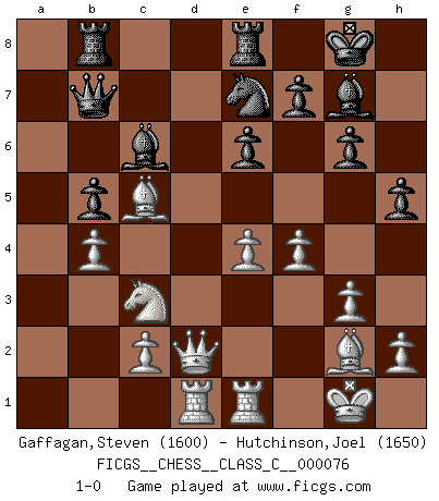Last move : 1-0 2008 November 10 8:34:3 [Event "FICGS__CHESS__CLASS_C__000076"] [Site "FICGS"] [Date "2008.03.20"] [Round "1"] [White "Gaffagan,Steven"] [Black "Hutchinson,Joel"] [Result "1-0"] [WhiteElo "1600"] [BlackElo "1650"] 1.e4 c5 2.Nc3 Nc6 3.g3 g6 4.Bg2 Bg7 5.d3 e6 6.f4 Nge7 7.Nf3 d6 8.O-O O-O 9.Be3 a6 10.d4 cxd4 11.Nxd4 Rb8 12.Qd2 b5 13.a3 Bb7 14.Rad1 Qc7 15.Nxc6 Bxc6 16.Qxd6 Qb7 17.Bc5 Rfe8 18.Qd2 a5 19.b4 axb4 20.axb4 h5 21.Rfe1 1-0 Sicilian : Closed Kingside Castling by player White (move 8) Kingside Castling by player Black (move 8) Player White won this chess game. Follow this game move after move (download)It is not a move, even the best move that you must seek, but a realizable plan. (Eugene Znosko-Borovsky) Das ganze Leben mit einer Ehefrau ist wie ein Endspiel mit ungleichfarbigen Läufern. (Viktor Kortschnoi) Dios mío, Bobby Fischer juega tan simple. (Alexei Suetin) Aidez vos pièces, elles vous aideront. (Paul Morphy) There's always a bigger fish. (Qui-Gon Jinn in Star Wars ep.1)