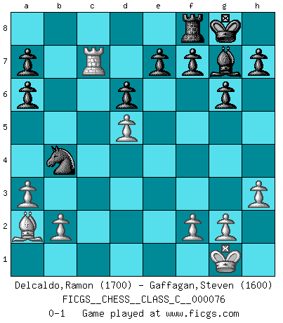 Last move : 0-1 2008 October 10 11:13:16 [Event "FICGS__CHESS__CLASS_C__000076"] [Site "FICGS"] [Date "2008.03.20"] [Round "1"] [White "Delcaldo,Ramon"] [Black "Gaffagan,Steven"] [Result "0-1"] [WhiteElo "1700"] [BlackElo "1600"] 1.e4 c5 2.a3 g6 3.d4 cxd4 4.c3 dxc3 5.Nxc3 Bg7 6.Nf3 Nc6 7.Bc4 Nf6 8.Qe2 d6 9.h3 O-O 10.O-O Nd7 11.Be3 Nde5 12.Nxe5 Nxe5 13.Ba2 Be6 14.Nd5 Bxd5 15.exd5 Rc8 16.Rac1 Qa5 17.Bd2 Qa4 18.Bb4 Qa6 19.Qxa6 bxa6 20.Rfd1 Rxc1 21.Rxc1 Nd3 22.Rc7 Nxb4 0-1 Sicilian defense Kingside Castling by player Black (move 9) Kingside Castling by player White (move 10) Player Black won this chess game. Follow this game move after move (download)Strategy requires thought, tactics require observation. (Max Euwe) Über die Verhaftung Bobby Fischers: Warum es die Bush-Administration für nötig befindet einen 61 Jahre alten Mann zu hetzten, der für niemanden ausser sich selbste eine Gefahr darstellt ist ein Rätsel. (Nigel Short) El Ajedrez es en su esencia, un juego. En su forma, un arte. Y en su ejecución, una ciencia. (Baron Tassilo) Tout change constamment, y compris dans le monde des Echecs. (Botvinnik) Perhaps chess is the wrong game for the times (The Chess Master and the Computer, by Garry Kasparov - 2010)