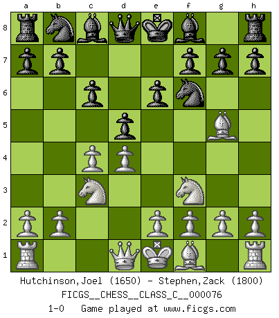 Last move : 1-0 2008 May 27 22:51:13 [Event "FICGS__CHESS__CLASS_C__000076"] [Site "FICGS"] [Date "2008.03.20"] [Round "1"] [White "Hutchinson,Joel"] [Black "Stephen,Zack"] [Result "1-0"] [WhiteElo "1650"] [BlackElo "1800"] 1.d4 d5 2.c4 c6 3.Nc3 e6 4.Nf3 Nf6 5.Bg5 1-0 This chess game has been lost on time (started : 2008.03.20 17:55:31) QGD Slav defense Player White won this chess game. Follow this game move after move (download)It began to feel as though you were playing against Chess itself. - On playing against Robert Fischer. (Walter Shipman) Als er Schachweltmeister wurde ließ er praktisch alle stärksten Sovietspieler für sich arbeiten. Wenn ein auch nur mittelmässiger Meister ein Spezialist für eine bestimmte Eröffnung war, wurde er von Karpov gerufen. Das wurde alles geheim gehalten. (Mikhail Moiseyevich Botvinik) Debes de llevar a tu oponente hacia un profundo y obscuro bosque donde 2+2=5, y el camino que conduce a la salida es suficientemente ancho para solamente uno. (Mikhail Tal) Il s'avisa de me proposer d'apprendre les échecs qu'il jouait un peu... me voilà forcené des échecs. J'achète un échiquier, je m'enferme dans ma chambre, j'y passe des jours et des nuits à vouloir apprendre par cur toutes les parties. (Jean-Jacques Rousseau, Confessions) The meaning of life is that it is to be lived, and it is not to be traded and conceptualized and squeezed into a pattern of systems. (Bruce Lee)