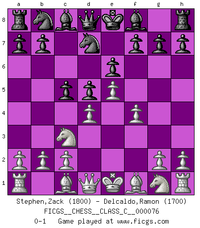 Last move : 0-1 2008 May 28 11:2:37 [Event "FICGS__CHESS__CLASS_C__000076"] [Site "FICGS"] [Date "2008.03.20"] [Round "1"] [White "Stephen,Zack"] [Black "Delcaldo,Ramon"] [Result "0-1"] [WhiteElo "1800"] [BlackElo "1700"] 1.e4 e6 2.d4 d5 3.Nc3 Nf6 4.e5 Nfd7 5.f4 c5 0-1 This chess game has been lost on time (started : 2008.03.20 17:55:31) French : Steinitz variation Player Black won this chess game. Follow this game move after move (download)Chess is a cold bath for the mind. (Sir John Simon) Ein Remis kann durch Wiederholung von drei Zügen oder durch einen schlechte Zug erreicht werden. (Savielly Grigorievitsch Tartakower) Todavía soy una víctima del Ajedrez. Tiene toda la belleza del arte y mucho mas. No puede ser comercializado. El Ajedrez es mas puro que el arte en su posición social. (Marcel Duchamp) D'abord les bases : Jouez et étudiez, puis étudiez et jouez, ensuite jouez et étudiez, puis étudiez et jouez. Deuxièmement : Donnez toujours le meilleur de vous-même ! (Ken Smith) Optimism is a variety of information deficit. Sometimes especially true for correspondence chess games. (Michael Aigner)