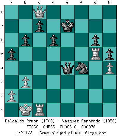 Last move : 1/2-1/2 2008 May 17 21:34:38 [Event "FICGS__CHESS__CLASS_C__000076"] [Site "FICGS"] [Date "2008.03.20"] [Round "1"] [White "Delcaldo,Ramon"] [Black "Vasquez,Fernando"] [Result "1/2-1/2"] [WhiteElo "1700"] [BlackElo "1950"] 1.e4 e5 2.Nf3 d6 3.d4 exd4 4.Nxd4 Nf6 5.Nc3 Be7 6.Bf4 O-O 7.Qd2 Nc6 8.O-O-O Nxd4 9.Qxd4 Be6 10.Kb1 a6 11.h3 Re8 12.Bc4 Nh5 13.Be3 Bf6 14.Qd3 Bxc4 15.Qxc4 Bxc3 16.Qxc3 Rxe4 17.g4 Nf6 18.g5 Nh5 19.Bc1 g6 20.b3 Qd7 21.Bb2 f6 22.gxf6 Rae8 23.Qd2 R8e6 24.Qg5 Re2 25.Rc1 Qb5 26.f7+ Kxf7 27.Qd8 Re7 28.Qh8 Qf5 29.Rhg1 R2e6 30.Qc8 Nf4 31.Rh1 b6 32.h4 Re2 33.Qh8 a5 34.Rhg1 h5 35.Rg5 Qe4 36.f3 Qxf3 37.Bf6 Qe4 38.Bxe7 Kxe7 39.Qc8 Rxc2 40.Rxc2 Qe1+ 41.Rc1 Qe4+ 42.Rc2 Qe1+ 43.Rc1 Qe4+ 1/2-1/2 Philidor : Exchange variation Kingside Castling by player Black (move 6) Queenside Castling by player White (move 8) This chess game ended in a draw. Follow this game move after move (download)Fischer is completely natural. He plays no roles. He's like a child. Very, very simple. (Zita Rajcsanyi) Als ich elf wurde, wurde ich einfach gut. (Robert James Fischer) El Ajedrez, como la música, como el amor, tiene el poder de hacer feliz a la gente. (Siegbert Tarrasch) Les échecs, c'est la lutte contre l'erreur. (Johannes Zukertort) At last I discovered the true beauty of chess. So I proposed to her. (Dinesh De Silva)