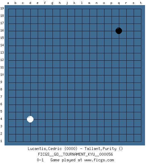 Last move : 0-1 2008 April 21 8:20:37 [Event "FICGS__GO__TOURNAMENT_KYU__000056"] [Site "FICGS"] [Date "2008.03.20"] [Round "1"] [Black "Lucantis,Cedric"] [White "Tallant,Purity"] [Result "0-1"] [Rating 1 "0000"] 1.q16 d4 0-1 This go game has been lost on time (started : 2008.03.20 18:20:59) Comment by player 2 : Purity Tallant : I think this guy has totally bombed out! Here are the names of the openings (joseki) played in the four corners : Corner d4 : d4 0-1 Hoshi (Hwajeom, Seongjeom, Xingwei`) 4-4 Point. The star or hoshi (4-4) point, emphasizing influence at the potential expense of territory. Player White won this Go (weiqi, baduk) game. Follow this game move after move (download)If your stone is capped, play the knight's move. (Anonymous) There is no vagueness without wind. (Chinese proverb)