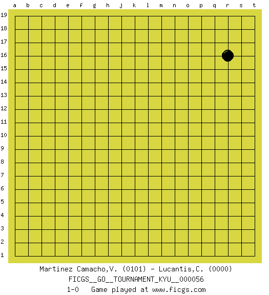 Last move : 1-0 2008 April 22 8:21:19 [Event "FICGS__GO__TOURNAMENT_KYU__000056"] [Site "FICGS"] [Date "2008.03.20"] [Round "1"] [Black "Martinez Camacho,Victor Hugo"] [White "Lucantis,Cedric"] [Result "1-0"] [Rating 1 "0101"] [Rating 2 "0000"] 1.r16 1-0 This go game has been lost on time (started : 2008.03.20 18:20:59) Here are the names of the openings (joseki) played in the four corners : Player Black won this Go (weiqi, baduk) game. Follow this game move after move (download)Sacrifice for shape. (Anonymous) Are you threatening me, Master Jedi ? (Chancellor Palpatine in Star Wars ep.3)