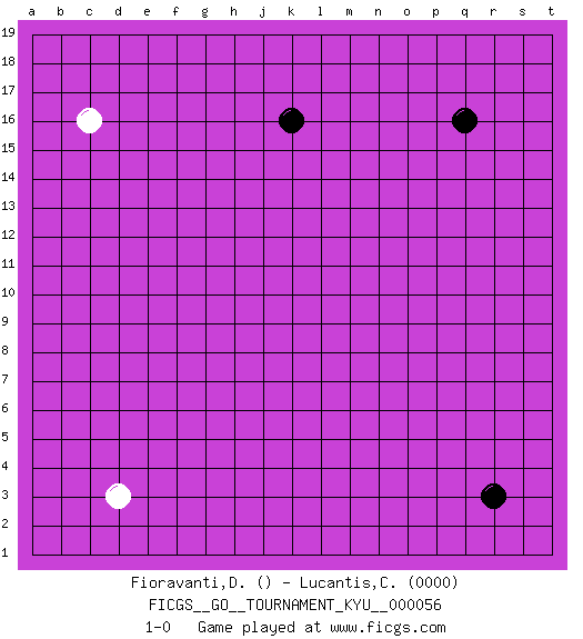 Last move : 1-0 2008 April 22 8:21:19 [Event "FICGS__GO__TOURNAMENT_KYU__000056"] [Site "FICGS"] [Date "2008.03.20"] [Round "1"] [Black "Fioravanti,Diego"] [White "Lucantis,Cedric"] [Result "1-0"] [Rating 2 "0000"] 1.k16 d3 2.r3 c16 3.q16 1-0 This go game has been lost on time (started : 2008.03.20 18:20:59) Here are the names of the openings (joseki) played in the four corners : Corner q4 : r3 1-0 San-San (Sam-Sam, San-San) 3-3 Point. The San-San (3-3) point, emphasizing territory at the expense of influence. Player Black won this Go (weiqi, baduk) game. Follow this game move after move (download)Pon-nuki is worth thirty points. (Anonymous) Whenever people agree with me, I always feel I must be wrong. (Oscar Wilde)