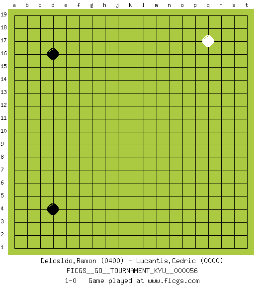 Last move : 1-0 2008 April 21 8:20:37 [Event "FICGS__GO__TOURNAMENT_KYU__000056"] [Site "FICGS"] [Date "2008.03.20"] [Round "1"] [Black "Delcaldo,Ramon"] [White "Lucantis,Cedric"] [Result "1-0"] [Rating 1 "0400"] [Rating 2 "0000"] 1.d4 q17 2.d16 1-0 This go game has been lost on time (started : 2008.03.20 18:20:59) Here are the names of the openings (joseki) played in the four corners : Corner d4 : d4 1-0 Hoshi (Hwajeom, Seongjeom, Xingwei`) 4-4 Point. The star or hoshi (4-4) point, emphasizing influence at the potential expense of territory. Player Black won this Go (weiqi, baduk) game. Follow this game move after move (download)Play slow, win slow; play fast, lose fast. (Anonymous) Hardware: the parts of a computer that can be kicked. (Jeff Persis)