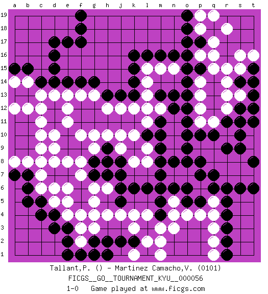 Last move : 1-0 2008 August 22 7:5:6 [Event "FICGS__GO__TOURNAMENT_KYU__000056"] [Site "FICGS"] [Date "2008.03.20"] [Round "1"] [Black "Tallant,Purity"] [White "Martinez Camacho,Victor Hugo"] [Result "1-0"] [Rating 2 "0101"] 1.d4 q16 2.p15 p16 3.o16 r14 4.q10 q15 5.p17 q17 6.q18 p14 7.o15 p18 8.o17 q19 9.o18 r18 10.o19 q11 11.o10 r10 12.p10 q9 13.o14 p12 14.o11 p11 15.o12 p13 16.o13 q4 17.t8 r8 18.p8 p9 19.o9 q8 20.q7 r7 21.r6 s7 22.s6 t7 23.t6 t9 24.o8 s8 25.p7 n4 26.q6 p19 27.s10 k4 28.r11 s11 29.r9 t10 30.t11 t12 31.s12 r12 32.t11 r13 33.s9 r15 34.t8 s13 35.s11 t14 36.d16 d10 37.c14 d6 38.f17 g4 39.t13 e5 40.c5 e4 41.d3 d5 42.c4 c6 43.b6 c7 44.e3 c9 45.b7 c8 46.a7 c10 47.b5 f3 48.e2 c12 49.e1 b8 50.t12 a8 51.t15 s15 52.s14 t16 53.t14 s16 54.f14 g10 55.d15 c11 56.d14 c13 57.e14 b14 58.b15 a14 59.a15 b12 60.e17 a12 61.d17 k12 62.f18 d13 63.k16 f13 64.g14 e13 65.f19 g13 66.j13 j12 67.h13 h12 68.k13 l13 69.k14 l14 70.k15 l15 71.l16 m15 72.m16 h10 73.n16 n15 74.n12 m12 75.m13 l11 76.m11 l12 77.l10 k10 78.m10 j10 79.p5 p4 80.o5 o4 81.n13 f4 82.m4 n5 83.m5 l4 84.m6 m3 85.n8 j4 86.r4 q3 87.r3 q2 88.r2 q1 89.r1 h4 90.r5 q5 91.n6 f2 92.f1 g1 93.g2 g3 94.h1 m2 95.h2 m1 96.m9 f10 97.e10 e11 98.e9 e12 99.f9 g9 100.g8 h8 101.h7 f8 102.g7 e8 103.h9 j9 104.j8 d8 105.h9 d9 106.h8 f7 107.j6 g6 108.k6 g5 109.l6 k8 110.j7 l9 111.m8 l8 112.m7 e6 113.l3 k3 114.j2 l2 115.k2 k1 116.g1 h6 117.j5 n3 118.o6 1-0 Here are the names of the openings (joseki) played in the four corners : Corner q16 : q16 p15 Hoshi (Hwajeom, Seongjeom, Xingwei`) 4-4 Point. The star or hoshi (4-4) point, emphasizing influence at the potential expense of territory. Corner d4 : d4 d6 Hoshi (Hwajeom, Seongjeom, Xingwei`) 4-4 Point. The star or hoshi (4-4) point, emphasizing influence at the potential expense of territory. Ikken Takagakari (Hankan Nop'dakeolch'im, Yi Gaojia, 1-Space High Approach). Black typically responds at 6-4 or 3-10. Black 4-10 is played when Black finds play on the right side advantageous. Black 4-8 or 3-8 may be played when Black has support at top. Player Black won this Go (weiqi, baduk) game. Follow this game move after move (download)Every move brings change. (Pierre Audouard) Follow your passion, and success will follow you. (Arthur Buddhold)