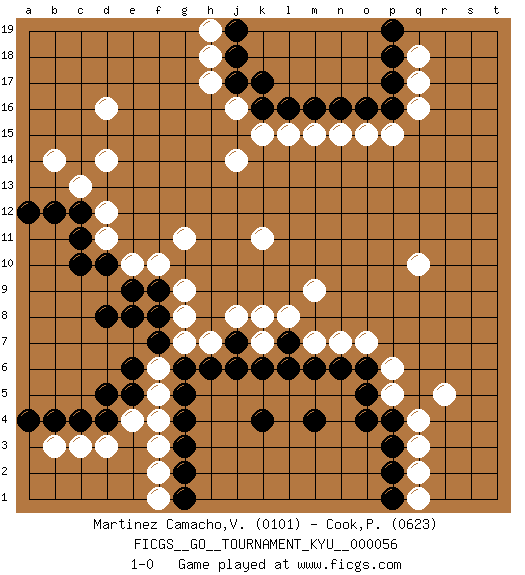 Last move : 1-0 2008 July 23 3:57:46 [Event "FICGS__GO__TOURNAMENT_KYU__000056"] [Site "FICGS"] [Date "2008.03.20"] [Round "1"] [Black "Martinez Camacho,Victor Hugo"] [White "Cook,Phil"] [Result "1-0"] [Rating 1 "0101"] [Rating 2 "0623"] 1.d5 d16 2.g4 q16 3.m4 q4 4.d10 d11 5.e8 e10 6.d8 g8 7.e9 f10 8.f9 q10 9.c11 d12 10.c10 g9 11.c12 d14 12.k4 k7 13.k6 h7 14.l7 m7 15.j7 k8 16.l6 j8 17.j6 l8 18.m6 o7 19.o6 p6 20.n6 n7 21.o5 p5 22.o4 g11 23.p4 r5 24.p3 q3 25.p2 q2 26.p1 q1 27.h6 m9 28.g6 g7 29.f8 c13 30.b12 k11 31.a12 b14 32.k16 k15 33.l16 l15 34.m16 m15 35.f7 j16 36.j17 j14 37.k17 h17 38.j18 h18 39.j19 h19 40.n16 n15 41.o16 o15 42.p16 p15 43.p17 q17 44.p18 q18 45.p19 f6 46.e6 f5 47.g5 f4 48.g3 f3 49.g2 f2 50.g1 f1 51.e5 e4 52.d4 d3 53.c4 c3 54.b4 b3 55.a4 1-0 This go game has been lost on time (started : 2008.03.20 18:20:59) Here are the names of the openings (joseki) played in the four corners : Corner q4 : m4 q4 This joseki is unknown. A weak or weird move has probably been played in this corner. Corner q16 : q16 l16 Hoshi (Hwajeom, Seongjeom, Xingwei`) 4-4 Point. The star or hoshi (4-4) point, emphasizing influence at the potential expense of territory. Player Black won this Go (weiqi, baduk) game. Follow this game move after move (download)There are players who don't accept exchange: they play many moves that perpetuate a previous state of the game. (Pierre Audouard) Over-the-board chess is the favorite of mortals, correspondence chess is the favorite of the gods. (Eduard Dyckhoff)