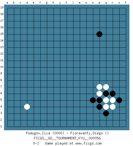 Last move : 0-1 2008 April 30 8:56:29 [Event "FICGS__GO__TOURNAMENT_KYU__000056"] [Site "FICGS"] [Date "2008.03.20"] [Round "1"] [Black "Podogov,Ilia"] [White "Fioravanti,Diego"] [Result "0-1"] [Rating 1 "0000"] 1.p15 q4 2.p4 q5 3.p5 p6 4.q6 q7 5.r6 p7 6.o5 d4 7.q3 r5 8.s5 r4 0-1 This go game has been lost on time (started : 2008.03.20 18:20:59) Here are the names of the openings (joseki) played in the four corners : Corner q4 : q4 p4 Hoshi (Hwajeom, Seongjeom, Xingwei`) 4-4 Point. The star or hoshi (4-4) point, emphasizing influence at the potential expense of territory. Player White won this Go (weiqi, baduk) game. Follow this game move after move (download)With less than 15 stones in danger, tenuki. (Anonymous) A mistake is only a mistake if you let it happen twice. Otherwise it is a learning experience. (Daniel Parmet)