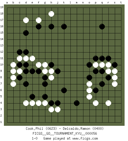 Last move : 1-0 2008 June 1 20:12:24 [Event "FICGS__GO__TOURNAMENT_KYU__000056 "] [Site "FICGS"] [Date "2008.03.20"] [Round "1"] [Black "Cook,Phil "] [White "Delcaldo,Ramon "] [Result "1-0"] [Rating 1 "0623"] [Rating 2 "0400"] 1.q16 d4 2.d15 r4 3.q7 p4 4.d7 f4 5.k6 d17 6.f16 f17 7.h16 h18 8.k16 r9 9.q9 q10 10.q11 p10 11.o10 o7 12.p6 o6 13.p9 r10 14.p11 o5 15.o8 s7 16.r8 s8 17.r11 c9 18.d9 b7 19.c8 b8 20.m4 h3 21.j4 j3 22.h4 g4 23.s10 s9 24.e5 e4 25.g5 b10 26.c10 b9 27.c12 c11 28.d10 d11 29.d12 e11 30.e9 f10 31.f9 g10 32.h10 g9 33.g8 h9 34.j9 h8 35.g7 1-0 Here are the names of the openings (joseki) played in the four corners : Corner q4 : r4 q7Komoku (Somok, Xiao~mu`) 3-4 Point. The komoku (3-4) point is the traditional corner enclosure move.. Corner d4 : d4 d7Hoshi (Hwajeom, Seongjeom, Xingwei`) 4-4 Point. The star or hoshi (4-4) point, emphasizing influence at the potential expense of territory.Nikken Takagakari (Dukan Nop'dakeolch'im, E`r Gaojia, 2-Space High Approach). Black 2 is a light approach move. Rarely played in even games, Black 2 is typically employed in handicap games. White continues with 6-4 or 3-10. In Korean Sunjang Baduk White has a stone on 8-4. Corner d16 : d15 d17Takamoku (Gomok, Gaomu`) 5-4 Point. The takamoku (high) point (5-4). With its emphasis on influence, the 5-4 point complements the 4-4 (hoshi) point in creating an influence-oriented fuseki.Komoku. Black responds with 3-3, 3-5, 4-6, 4-7, 3-6, 3-7. Player Black won this Go (weiqi, baduk) game.Follow this game move after move (download ) Five groups might live but the six will die. (Anonymous) Man with more than one clock never knows what time it is. (Chinese thought)