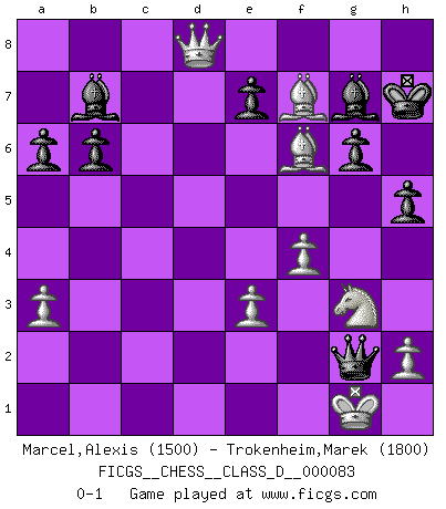 Last move : 0-1 2008 March 26 20:19:19 [Event "FICGS__CHESS__CLASS_D__000083"] [Site "FICGS"] [Date "2008.03.20"] [Round "1"] [White "Marcel,Alexis"] [Black "Trokenheim,Marek"] [Result "0-1"] [WhiteElo "1500"] [BlackElo "1800"] 1.f4 d5 2.Nf3 Nf6 3.b3 g6 4.Bb2 Bg7 5.e3 O-O 6.Be2 c5 7.O-O Nc6 8.a3 b6 9.Nc3 h6 10.Bd3 a6 11.Ne2 Qd7 12.Ne5 Nxe5 13.Bxe5 Bb7 14.Ng3 Rad8 15.Qe2 c4 16.bxc4 dxc4 17.Bxc4 Qxd2 18.Rad1 Qa5 19.Bb2 h5 20.Rxd8 Rxd8 21.Rd1 Rxd1+ 22.Qxd1 Qc5 23.Qd8+ Kh7 24.Bxf7 Qxc2 25.Bxf6 Qxg2+ 0-1 Bird's Opening Kingside Castling by player Black (move 5) Kingside Castling by player White (move 7) Player Black won this chess game. Follow this game move after move (download)Who is your opponent tonight, tonight I am playing against the Black pieces. (Akiba Rubinstein) Fallen sollten polizeilich verboten werden. (Savielly Grigorievitsch Tartakower) En partidas rápidas, el Caballo es mas poderoso que el Alfil. (Vlastimil Hort) Le jeu d'échecs fait naître et fortifie en nous plusieurs qualités précieuses dans le cours de l'existence, telles que la prévoyance, la circonspection, la prudence, et la persévérance. (Benjamin Franklin - 1783, la morale des échecs) When you stop learning you start dying. (Scott Adams)