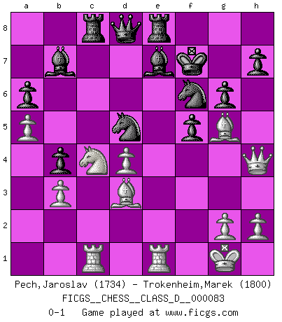 Last move : 0-1 2008 August 12 17:6:58 [Event "FICGS__CHESS__CLASS_D__000083"] [Site "FICGS"] [Date "2008.03.20"] [Round "1"] [White "Pech,Jaroslav"] [Black "Trokenheim,Marek"] [Result "0-1"] [WhiteElo "1734"] [BlackElo "1800"] 1.d4 d5 2.c4 c6 3.Nf3 Nf6 4.Nc3 e6 5.e3 Nbd7 6.Bd3 dxc4 7.Bxc4 b5 8.Bd3 a6 9.a4 b4 10.Ne4 c5 11.O-O Bb7 12.Ned2 Be7 13.Qe2 O-O 14.Ne5 Rc8 15.Ndc4 Qc7 16.a5 Rfd8 17.f4 g6 18.Rd1 Bd5 19.b3 cxd4 20.exd4 Bb7 21.Re1 Nd5 22.Qf2 N7f6 23.f5 exf5 24.Bh6 Bf8 25.Bg5 Re8 26.Rac1 Qd8 27.Qh4 Be7 28.Nxf7 Kxf7 0-1 This chess game has been lost on time (started : 2008.03.20 18:44:36) QGD Slav : 4.Nc3 Kingside Castling by player White (move 11) Kingside Castling by player Black (move 13) Player Black won this chess game. Follow this game move after move (download)By the beauty of his games, the clarity of his play, and the brilliance of his ideas, Fischer made himself an artist of the same stature as Brahms, Rembrandt, and Shakespeare. (David Levy) Die Idee von Capablanca, Schach als Fach in den Schulen zu lehren, ist großartig. (Fidel Castro) El estómago es una parte esencial del maestro de Ajedrez. (Bent Larsen) Il vaut mieux sacrifier les pièces de l'adversaire. (Xavier Tartacover) SEO proverb : Make your website optimized for human beings, not for search engines.
