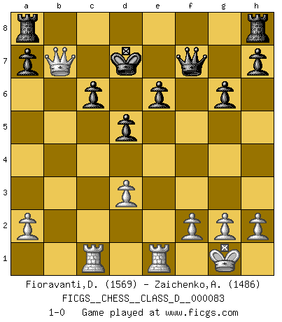 Last move : 1-0 2008 May 27 14:25:8 [Event "FICGS__CHESS__CLASS_D__000083"] [Site "FICGS"] [Date "2008.03.20"] [Round "1"] [White "Fioravanti,Diego"] [Black "Zaichenko,Andrey"] [Result "1-0"] [WhiteElo "1569"] [BlackElo "1486"] 1.Na3 Nf6 2.Nc4 Nc6 3.d4 d5 4.Ne5 Nxe5 5.dxe5 Ng4 6.Nf3 f6 7.Bf4 fxe5 8.Nxe5 Nxe5 9.Bxe5 Bf5 10.e4 Bxe4 11.Bd3 Bxd3 12.cxd3 Qd7 13.Rc1 c6 14.O-O e6 15.Qg4 Qf7 16.Rfe1 Kd7 17.b4 Bd6 18.Bxd6 Kxd6 19.b5 g6 20.bxc6 bxc6 21.Qb4+ Kd7 22.Qb7+ 1-0 Durkin's attack Kingside Castling by player White (move 14) Player White won this chess game. Follow this game move after move (download)Bobby just drops the pieces and they fall on the right squares. (Miguel Najdorf) Je mehr wir mit Computern analysieren, desto mehr glauben wir an Verteidigung. (Vladimir Kramnik) Los problemas de Ajedrez exigen del compositor las mismas virtudes que caracterizan todo el arte de valor: originalidad, invención, concisión, armonía, complejidad e insinceridad explendida. (Vladimir Nabokov) Les Echecs mettent en conflit, non pas deux intelligences, mais deux volontés. (Lasker) All politicians must be presumed guilty until they are proven innocent. (Dinesh De Silva)