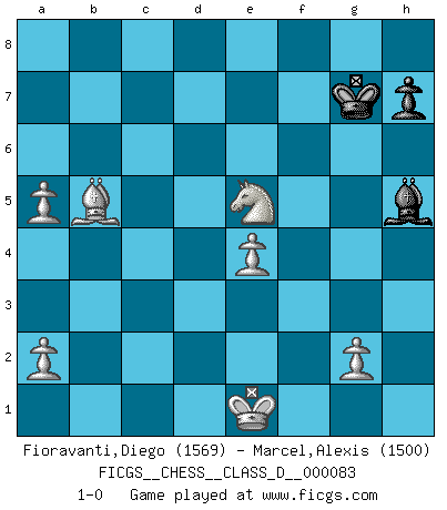 Last move : 1-0 2008 June 23 12:38:41 [Event "FICGS__CHESS__CLASS_D__000083"] [Site "FICGS"] [Date "2008.03.20"] [Round "1"] [White "Fioravanti,Diego"] [Black "Marcel,Alexis"] [Result "1-0"] [WhiteElo "1569"] [BlackElo "1500"] 1.Na3 e5 2.d4 Bxa3 3.bxa3 exd4 4.Qxd4 Nf6 5.Qe5+ Qe7 6.Qxe7+ Kxe7 7.Bb2 d6 8.h4 Nc6 9.h5 Be6 10.h6 gxh6 11.Rxh6 Ne5 12.Rxf6 Kxf6 13.f4 Bf5 14.Nf3 Bxc2 15.fxe5+ dxe5 16.Bxe5+ Kg6 17.Bxh8 Rxh8 18.Rc1 Ba4 19.Rxc7 Bc6 20.Ne5+ Kg7 21.Rxf7+ Kg8 22.Rc7 Be8 23.e4 b5 24.Rxa7 Bh5 25.Bxb5 Kf8 26.Ra8+ Kg7 27.Rxh8 Kxh8 28.a4 Kg7 29.a5 1-0 Durkin's attack 10 pieces endgame at move 27 : White KBNPPPP , Black KBP WHITE : King + 1 Bishop 1 Knight 4 Pawns BLACK : King + 1 Bishop 1 Pawn Player White won this chess game. Follow this game move after move (download)There just isn't enough televised Chess. (David Letterman) Der 70jährige Viktor Kortschnoi: Die Rentenanstalt wollte mich zwingen in Rente zu gehen. Meine Frau erhält jetzt eine Pension- und ich zahle weiter in die Rentenkasse ein! (Viktor Kortschnoi) En un gambito tu regalas un Peón por el bién de tomar un juego perdido. (Samuel Standige Boden) Il n'y a pas eu de défaite parce que je ne crois pas que cet ordinateur ait jamais existé. IBM a triché en refusant d'imprimer les modes de recherche de la machine. C'est évident, pendant le match, des coups décisifs ont été joués par des êtres humains. Aujourd'hui, les meilleurs spécialistes en informatique ne peuvent toujours pas expliquer comment Deep-Blue a pu jouer contre la logique des ordinateurs. IBM a gagné une guerre de communication, mais ils sont incapables de prouver que l'ordinateur a gagné tout seul. (Garry Kasparov) How many people work in NATO Headquarters ? - About half of them. (Dirk Stikker, NATO general secretary)