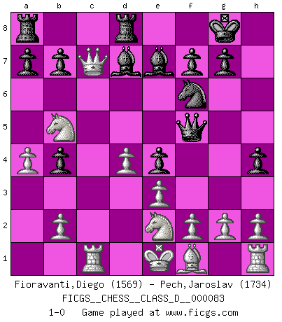 Last move : 1-0 2008 September 8 11:46:5 [Event "FICGS__CHESS__CLASS_D__000083"] [Site "FICGS"] [Date "2008.03.20"] [Round "1"] [White "Fioravanti,Diego"] [Black "Pech,Jaroslav"] [Result "1-0"] [WhiteElo "1569"] [BlackElo "1734"] 1.Na3 e5 2.d4 e4 3.c4 Nf6 4.Nc2 d5 5.cxd5 Qxd5 6.e3 Be7 7.Ne2 O-O 8.Ng3 h5 9.Bd2 Rd8 10.Na3 h4 11.Ne2 Qf5 12.Rc1 c5 13.Qc2 Na6 14.Nb5 Bd7 15.a4 Nb4 16.Bxb4 cxb4 17.Qc7 1-0 This chess game has been lost on time (started : 2008.03.20 18:44:36) Durkin's attack Kingside Castling by player Black (move 7) Player White won this chess game. Follow this game move after move (download)Chess is a part of culture and if a culture is declining then Chess too will decline. (Mikhail Botvinnik) Jeder Fehler erscheint unglaublich dumm, wenn andre ihn begehen. (Georg Christoph Lichtenberg) Tu eres para mi la Reina en d8 y yo soy el Peón en d7!!. (GM Eduard Gufeld) Les échecs sont utiles à l'exercice de la faculté de penser et à celle de l'imagination. Car nous devons posséder une méthode élaborée pour atteindre des buts partout où nous devons conduire notre raison. (Leibnitz) Luck never gives; it only lends. (Swedish proverb)