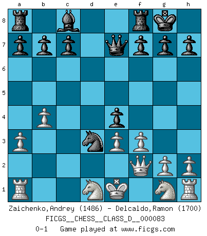 Last move : 0-1 2008 April 20 17:57:14 [Event "FICGS__CHESS__CLASS_D__000083"] [Site "FICGS"] [Date "2008.03.20"] [Round "1"] [White "Zaichenko,Andrey"] [Black "Delcaldo,Ramon"] [Result "0-1"] [WhiteElo "1486"] [BlackElo "1700"] 1.b4 e5 2.a3 d5 3.Bb2 Bd6 4.e3 Nf6 5.Be2 e4 6.d3 Qe7 7.Nd2 Nc6 8.dxe4 dxe4 9.f3 Be5 10.c3 Nd5 11.Nc4 Nxc3 12.Qc2 Nxe2 13.Qxe2 Bxb2 14.Nxb2 O-O 15.Nd1 Ne5 16.Qf2 Nd3+ 0-1 Polish (Sokolsky) opening Kingside Castling by player Black (move 14) Player Black won this chess game. Follow this game move after move (download)One doesn't have to play well, it's enough to play better than your opponent. (Siegbert Tarrasch) Ein Gewinn durch eine ungenaue Kombination, sei sie auch noch so vorzeigbar, erfüllt mich mit Schaudern. (Wilhelm Steinitz) No hay otro maestro que tenga una voluntad terrífica de ganar. Al tablero, el irradía peligro y aún los oponentes mas fuertes tienden a congelarse como liebres cuando olfatean a una pantera. Aún sus debilidades son peligrosas. Con las blancas, su juego de apertura es predecible - te es posible hacer planes en su contra - pero es tan fuerte que tus planes casi nunca funcionan. En el juego medio, su precisión e invención son fabulosas y en finales, tú simplemente no le puedes vencer. (Experto Alemán anónimo) Celui qui prend des risques peut perdre, celui qui n'en prend pas perd toujours. (Xavier Tartacover) A good aphorism is too hard for the tooth of time, and is not worn away with the centuries, although it serves as food for every speech. (Friedrich Nietzsche)