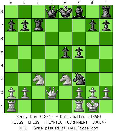 Last move : 0-1 2008 June 24 9:26:16 [Event "FICGS__CHESS__THEMATIC_TOURNAMENT__000047"] [Site "FICGS"] [Date "2008.03.22"] [Round "1"] [White "Serd,Than"] [Black "Coll,Julien"] [Result "0-1"] [WhiteElo "1331"] [BlackElo "1865"] 1.e4 c6 2.d4 d5 3.exd5 cxd5 4.c4 Nf6 5.Nc3 Nc6 6.Nf3 Bg4 7.Bg5 Ne4 8.Be2 Nxg5 9.Nxg5 Bxe2 10.Qxe2 Nxd4 11.Qd2 e5 12.Nxd5 Rc8 13.O-O Rxc4 14.Ne3 Rc7 15.Ne4 f5 16.Nc3 Nf3+ 0-1 Caro-Kann : Panov-Botvinnik attack Kingside Castling by player White (move 13) Player Black won this chess game. Follow this game move after move (download)The chessboard is the world, the pieces are the phenomena of the Universe, the rules of the game are what we call the laws of Nature and the player on the other side is hidden from us. (Thomas Huxley) Es ist schade, dass viele Schachsportler vergessen, wie wichtig Auftreten und angemessene Kleidung sind. (Alexandra Kosteniuk) Al jugar al Ajedrez entonces, podemos aprender: Primero: Previsión... Segundo: Prudencia... Tercero: Cautela... Y al final, aprendemos del Ajedrez el hábito de no ser desanimados por apariencias malas presentes en el estado de nuestros asuntos, el hábito de la esperanza por una oportunidad favorable y la perseveración de los secretos de los recursos. (Benjamin Franklin) Le joueur d'Echecs qui veut atteindre le top est obligé de développer son propre credo créatif. Alexeï Stepanovicth Souétine. Il est facile d'écrire des livres ! Ce qui est difficile, c'est de jouer ! (Alexeï Stepanovicth Souétine) The meaning of life is that it is to be lived, and it is not to be traded and conceptualized and squeezed into a pattern of systems. (Bruce Lee)