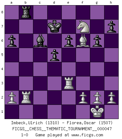Last move : 1-0 2008 June 30 0:57:47 [Event "FICGS__CHESS__THEMATIC_TOURNAMENT__000047"] [Site "FICGS"] [Date "2008.03.22"] [Round "1"] [White "Imbeck,Ulrich"] [Black "Florea,Oscar"] [Result "1-0"] [WhiteElo "1310"] [BlackElo "1507"] 1.e4 c6 2.d4 d5 3.exd5 cxd5 4.c4 Nf6 5.Nc3 e6 6.c5 g6 7.Bf4 Bg7 8.Bd6 Qa5 9.Qd2 Ne4 10.Nxe4 Qxd2+ 11.Nxd2 Bxd4 12.Rb1 Nc6 13.Ngf3 Bg7 14.Bb5 Bd7 15.O-O a6 16.Bxc6 Bxc6 17.Rfe1 Kd7 18.Ne5+ Bxe5 19.Bxe5 Rhf8 20.Bf6 Rab8 21.Re3 b6 22.cxb6 Rxb6 23.Nf3 Rfb8 24.Ng5 Rb4 25.Nxf7 Rxb2 26.Rxb2 1-0 Caro-Kann : Panov-Botvinnik attack, 5...e6 Kingside Castling by player White (move 15) Player White won this chess game. Follow this game move after move (download)An attack on the wing should be met by play in the center. (Nimzovitch) Die FIDE ist dabei in die Hände der russischen Mafia zu fallen. (Larry Evans) No existe un remordimiento como el remordimiento del Ajedrez. (H. G. Wells) Les ravages du H expliquent la différence de niveau entre Tal et Thal [Abergel]. I teach you to lie, cheat and steal, and as soon as my back's turned you wait in line ? (Gregory House, House M.D.)