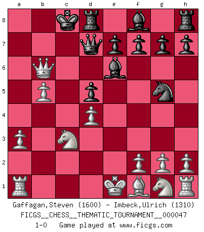 Last move : 1-0 2008 August 11 13:12:42 [Event "FICGS__CHESS__THEMATIC_TOURNAMENT__000047"] [Site "FICGS"] [Date "2008.03.22"] [Round "1"] [White "Gaffagan,Steven"] [Black "Imbeck,Ulrich"] [Result "1-0"] [WhiteElo "1600"] [BlackElo "1310"] 1.e4 c6 2.d4 d5 3.exd5 cxd5 4.c4 Nf6 5.Nc3 Nc6 6.Bg5 Be6 7.a3 Qd7 8.b4 O-O-O 9.b5 Na5 10.c5 Ne4 11.Qa4 Nxg5 12.Qxa5 b6 13.cxb6 axb6 14.Qa8+ Kc7 15.Qa7+ Kc8 16.Qxb6 1-0 Caro-Kann : Panov-Botvinnik attack Queenside Castling by player Black (move 8) Player White won this chess game. Follow this game move after move (download)Bobby Fischer is the greatest Chess player who has ever lived. (Ken Smith) Ich habe Putins Aufstieg an die Macht beobachtet und seine Politik, die demokratischen Institutionen meines Landes zu zerstören. (Garry Kasparov) Mi estilo es algo parecido entre un poco de Tal y Petrosian. (Reshevsky) Celui qui prend des risques peut perdre, celui qui n'en prend pas perd toujours. (Xavier Tartacover) Whenever people agree with me, I always feel I must be wrong. (Oscar Wilde)
