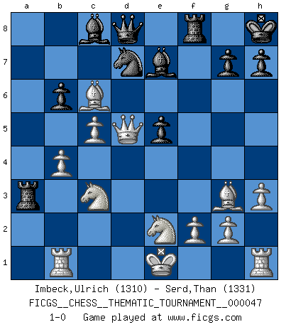 Last move : 1-0 2008 May 30 11:38:37 [Event "FICGS__CHESS__THEMATIC_TOURNAMENT__000047"] [Site "FICGS"] [Date "2008.03.22"] [Round "1"] [White "Imbeck,Ulrich"] [Black "Serd,Than"] [Result "1-0"] [WhiteElo "1310"] [BlackElo "1331"] 1.e4 c6 2.d4 d5 3.exd5 cxd5 4.c4 e6 5.Nc3 Nf6 6.c5 Nc6 7.Bb5 Be7 8.Bf4 O-O 9.a3 Nd7 10.b4 f6 11.h3 a5 12.Rb1 axb4 13.axb4 e5 14.dxe5 fxe5 15.Qxd5+ Kh8 16.Bg3 Ra3 17.Nge2 b6 18.Bxc6 1-0 Caro-Kann : Panov-Botvinnik attack Kingside Castling by player Black (move 8) Player White won this chess game. Follow this game move after move (download)All my games are real. (Bobby Fischer) Heutzutage gewinnt im Turnier nicht derjenige Spieler, der weitreichende Pläne entwirft, sondern einfach jener, der Zug um Zug kämpft. (David Bronstein) El Ajedrez es imaginación. (David Bronstein) J'ai toujours senti une vague pitié pour l'homme qui ne connaît rien aux échecs, tout comme j'en aurais pour un homme ignorant de l'amour. Les Echecs, comme la musique ou comme l'amour, ont le pouvoir de rendre heureux. (Siegbert Tarrasch) Every man's memory is his private literature. (Aldous Huxley)