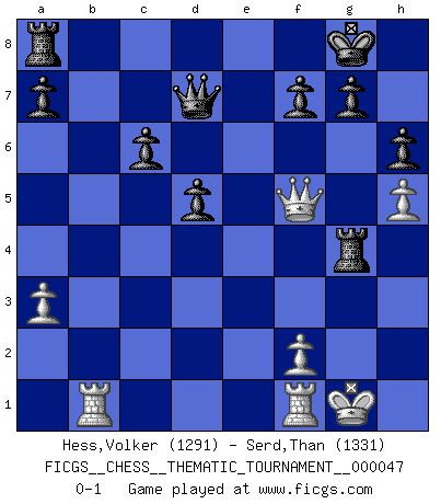 Last move : 0-1 2008 April 9 14:26:8 [Event "FICGS__CHESS__THEMATIC_TOURNAMENT__000047"] [Site "FICGS"] [Date "2008.03.22"] [Round "1"] [White "Hess,Volker"] [Black "Serd,Than"] [Result "0-1"] [WhiteElo "1291"] [BlackElo "1331"] 1.e4 c6 2.d4 d5 3.exd5 cxd5 4.c4 Nf6 5.Nc3 e6 6.Nf3 Bb4 7.cxd5 exd5 8.Bd3 O-O 9.O-O Nc6 10.Ne5 h6 11.Ne2 Bg4 12.Nxc6 bxc6 13.a3 Ba5 14.Bd2 Bxd2 15.Qxd2 Bxe2 16.Qxe2 Qb6 17.Rad1 Rfe8 18.Qf3 Qxb2 19.Qf5 Qxd4 20.Qf3 Qb6 21.h4 Ne4 22.g4 Re6 23.Bxe4 Rxe4 24.h5 Qc7 25.Rb1 Qd7 26.Qf5 Rxg4+ 0-1 Caro-Kann : Panov-Botvinnik attack, 5...e6 Kingside Castling by player Black (move 8) Kingside Castling by player White (move 9) Player Black won this chess game. Follow this game move after move (download)When you absolutely don't know what to do anymore, it is time to panic. (John van der Wiel) Versuche, dich von der Sklaverei der Eröffnungsvarianten zu befreien. Stattdessen soll man gewisse Typenpositionen erlernen, die man eingehend analysiert. (Aaron Nimzowitsch) Los Peones son el alma de una partida de Ajedrez. (Francois Andre Danican Philidor) Mais l'homme est une créature légère et illogique : semblable au joueur d'échecs, il n'aime que le processus du but à atteindre, non le but lui-même. (Dostoïevsky) Luck is the residue of design. (John Milton)