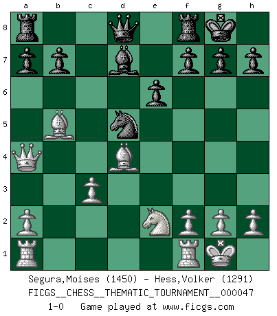 Last move : 1-0 2008 March 27 6:56:31 [Event "FICGS__CHESS__THEMATIC_TOURNAMENT__000047"] [Site "FICGS"] [Date "2008.03.22"] [Round "1"] [White "Segura,Moises"] [Black "Hess,Volker"] [Result "1-0"] [WhiteElo "1450"] [BlackElo "1291"] 1.e4 c6 2.d4 d5 3.exd5 cxd5 4.c4 e6 5.Nc3 Nf6 6.Be3 Bb4 7.Qa4+ Nc6 8.cxd5 Bxc3+ 9.bxc3 Nxd5 10.Bb5 Bd7 11.Ne2 O-O 12.O-O Nxd4 13.Bxd4 1-0 Caro-Kann : Panov-Botvinnik attack Kingside Castling by player Black (move 11) Kingside Castling by player White (move 12) Player White won this chess game. Follow this game move after move (download)Openings teach you openings. Endgames teach you chess ! (Stephan Gerzadowicz) Schach ist die gewalttätigste aller Sportarten. (Garry Kasparov) Yo no creo en la psicología. Yo creo en las buenas movidas. (Bobby Fischer) La victoire dans une partie d'Echecs appartient la plupart du temps à celui qui voit un peu plus loin que l'adversaire. (Lasker) Luck is what you have left over after you give 100 percent. (Langston Coleman)