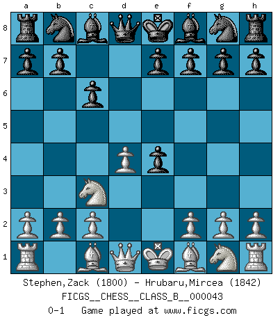 Last move : 0-1 2008 May 29 11:7:24 [Event "FICGS__CHESS__CLASS_B__000043"] [Site "FICGS"] [Date "2008.03.25"] [Round "1"] [White "Stephen,Zack"] [Black "Hrubaru,Mircea"] [Result "0-1"] [WhiteElo "1800"] [BlackElo "1842"] 1.e4 c6 2.d4 d5 3.Nc3 dxe4 0-1 This chess game has been lost on time (started : 2008.03.25 11:48:59) Caro-Kann defense Player Black won this chess game. Follow this game move after move (download)Chess is in its essence a game, in its form an art, and in its execution a science. (Baron Tassilo) Ein Schachspiel besteht aus drei Phasen: Die erste, wenn du hofftst den Vorteil zu haben, die zweite, wenn du glaubst einen Vorteil zu haben, und die dritte.... wenn du weißt Du wirst verlieren. (Savielly Grigorievitsch Tartakower) Sin errores no puede haber brillantez. (Emanuel Lasker) Je fais ceci parce que dans cinquante coups j'obtiendrai cela; je m'appelle Mikhail Moisevitch Botvinnik. (Botvinnik) Just because you do not take an interest in politics doesn't mean politics won't take an interest in you. (Pericles 430 B.C.)