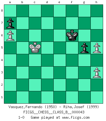 Last move : 1-0 2008 May 17 13:43:16 [Event "FICGS__CHESS__CLASS_B__000043"] [Site "FICGS"] [Date "2008.03.25"] [Round "1"] [White "Vasquez,Fernando"] [Black "Riha,Josef"] [Result "1-0"] [WhiteElo "1950"] [BlackElo "1999"] 1.e4 d5 2.exd5 Nf6 3.Nf3 Nxd5 4.d4 g6 5.c4 Nb6 6.a4 Bf5 7.Nc3 Bg7 8.a5 Nc8 9.Qb3 Nd7 10.h3 c5 11.d5 Nd6 12.g4 Be4 13.Nxe4 Nxe4 14.Bd3 Nd6 15.O-O O-O 16.Bf4 Qc7 17.Rfe1 Rae8 18.Bf1 Nb8 19.Ne5 Nd7 20.Nd3 e5 21.dxe6 fxe6 22.a6 b6 23.Bg2 Bd4 24.Bg3 e5 25.Rad1 Kh8 26.Re2 g5 27.Rde1 Nf7 28.Bd5 Re7 29.Qa4 Nd8 30.Qc2 Qd6 31.Qd2 Qf6 32.Kh2 Rfe8 33.b4 cxb4 34.Nxb4 Bc5 35.Nd3 Bd4 36.Bh1 Bc5 37.Kg1 Bd6 38.Re3 Qg7 39.Qb2 Rf8 40.Qb5 Nf7 41.Bd5 h6 42.Kg2 Nd8 43.Kh1 Qf6 44.R1e2 Rfe8 45.Qb2 Bc7 46.Rd2 Bd6 47.Kg1 Nc5 48.Nb4 Na4 49.Qb3 Bxb4 50.Qxb4 Nc5 51.Qb2 Kh7 52.Rde2 Nf7 53.Rf3 Qg7 54.Rf5 Nd7 55.Bc6 Qg6 56.Be4 Kg8 57.Rxe5 Qf6 58.Rxe7 Rxe7 59.Bd5 Rxe2 60.Qxe2 Kf8 61.Qe4 Nc5 62.Qh7 Ne6 63.Kg2 Ke7 64.Qe4 Nd6 65.Qxe6+ Qxe6 66.Bxe6 Kxe6 67.Bxd6 Kxd6 68.f4 Ke6 69.f5+ Kf6 70.Kf3 Ke5 71.Ke3 h5 72.gxh5 Kxf5 73.Kd4 Kf6 74.c5 bxc5+ 75.Kxc5 1-0 Scandinavian defense Kingside Castling by player White (move 15) Kingside Castling by player Black (move 15) 10 pieces endgame at move 72 : White KPPPPP , Black KPPP WHITE : King + 5 Pawns BLACK : King + 3 Pawns 9 pieces endgame at move 72 : White KPPPP , Black KPPP WHITE : King + 4 Pawns BLACK : King + 3 Pawns 8 pieces endgame at move 74 : White KPPP , Black KPPP WHITE : King + 3 Pawns BLACK : King + 3 Pawns 7 pieces endgame at move 75 : White KPPP , Black KPP WHITE : King + 3 Pawns BLACK : King + 2 Pawns Player White won this chess game. Follow this game move after move (download)Chess is war over the board. The object is to crush the opponents mind. (Bobby Fischer) Wer mein Gambit spielt, muß bereit sein, alle Brücken hinter sich abzubrechen. Es verändert den ganzen Menschen. Es wirkt wie ein Zauberstab und fördert verkümmerte, gute Charakter- eigenschaften wieder zu Tage. (Emil Joseph Diemer) No solamente yo pronostico su triunfo sobre Botvinnik, sino que me adelanto y digo que probablemente Fischer es el jugador de Ajedrez mas grande que haya existido. (John Collins) À la honte des hommes, on sait que les lois du jeu sont les seules qui soient partout justes, claires, inviolables et exécutées. Pourquoi l'Indien qui a donné les règles du jeu d'échecs est-il obéi de bon gré dans toute la terre, et que les décrétales des papes, par exemple, sont aujourd'hui un objet d'horreur et de mépris ? C'est que l'inventeur des échecs combina tout avec justesse pour la satisfaction des joueurs, et que les papes, dans leurs décrétales, n'eurent en vue que leur seul avantage. L'Indien voulut exercer également l'esprit des hommes et leur donner du plaisir; les papes ont voulu abrutir l'esprit des hommes. Voltaire (Dictionnaire philosophique / Garnier 1967) Warrior pose battles inner weakness and wins focus. You see that there is no war within you. You're on your own side, and you are your own strength. (Terri Guillemets)