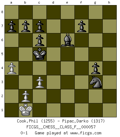 Last move : 0-1 2008 July 4 18:13:57 [Event "FICGS__CHESS__CLASS_F__000057"] [Site "FICGS"] [Date "2008.03.25"] [Round "1"] [White "Cook,Phil"] [Black "Pipac,Darko"] [Result "0-1"] [WhiteElo "1255"] [BlackElo "1317"] 1.e4 e5 2.Nf3 Nc6 3.d4 exd4 4.Nxd4 Qh4 5.Nxc6 Qxe4+ 6.Be3 Qxc6 7.Qd2 Nf6 8.Nc3 Bb4 9.O-O-O O-O 10.Bb5 Bxc3 11.Bxc6 Bxd2+ 12.Bxd2 dxc6 13.f3 Be6 14.Kb1 Rad8 15.Bb4 Rxd1+ 16.Rxd1 Nd5 17.Bxf8 Kxf8 18.Rd2 Ne3 19.g4 Nc4 20.Rd8+ Ke7 21.Rh8 h6 22.h4 Nd2+ 23.Ka1 Nxf3 24.Rh7 Kf6 25.g5+ hxg5 26.hxg5+ Nxg5 27.Rh2 Ke5 28.a4 Nf3 29.Rg2 g5 30.Re2+ Kd6 31.Re3 Nd4 32.Kb1 g4 33.c3 Nf5 34.Rd3+ Kc5 35.Rg3 Nxg3 0-1 Scotch : Pulling counter-attack Queenside Castling by player White (move 9) Kingside Castling by player Black (move 9) Player Black won this chess game. Follow this game move after move (download)Chess is war over the board. The object is to crush the opponents mind. (Bobby Fischer) Die Idee von Capablanca, Schach als Fach in den Schulen zu lehren, ist großartig. (Fidel Castro) Haz el enroque temprano y seguido. (Rob Sillars) A ce moment-là, je menaçais de comprendre la position ! (Clément L'Heureux) If you lose the game you should win the analysis! (Proverb)