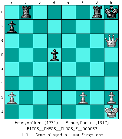 Last move : 1-0 2008 May 6 18:2:0 [Event "FICGS__CHESS__CLASS_F__000057"] [Site "FICGS"] [Date "2008.03.25"] [Round "1"] [White "Hess,Volker"] [Black "Pipac,Darko"] [Result "1-0"] [WhiteElo "1291"] [BlackElo "1317"] 1.e4 e5 2.Nf3 Nc6 3.Bb5 Nd4 4.Nxd4 exd4 5.O-O c6 6.Bc4 Nf6 7.d3 Bb4 8.c3 dxc3 9.bxc3 Ba5 10.Bg5 O-O 11.e5 h6 12.Bxh6 gxh6 13.exf6 Qxf6 14.Qg4+ Kh8 15.Bb3 Bxc3 16.Nxc3 Qxc3 17.Rac1 Qxd3 18.Rfd1 Qg6 19.Qd4+ Kh7 20.Bc2 f5 21.g4 d5 22.Kh1 Kg8 23.gxf5 Bxf5 24.Rg1 Bxc2 25.Rxg6+ Bxg6 26.Rg1 Kh7 27.Rxg6 Kxg6 28.Qg4+ Kh7 29.Qd7+ Kh8 30.Qxb7 Rab8 31.Qxc6 Rg8 32.Qxh6+ 1-0 Ruy Lopez : Bird's defense Kingside Castling by player White (move 5) Kingside Castling by player Black (move 10) 10 pieces endgame at move 32 : White KQPPP , Black KRRPP WHITE : King + 1 Queen 3 Pawns BLACK : King + 2 Rooks 2 Pawns Player White won this chess game. Follow this game move after move (download)Via the squares on the chessboard, the Indians explain the movement of time and the age, the higher influences which control the world and the ties which link Chess with the human soul. (Al-Masudi) Ein Großmeister muß tausende Partien in seinem Kopf speichern, denn diese sind für Ihn, was die Worte der Muttersprache für gewöhnliche Leute sind, oder Noten für Musiker... (Garry Kasparov) Dejen al perfeccionista jugar por correo. (Yasser Seirawan) Le profane ne songe pas à la somme de jouissance dont il se prive, qui méconnaît ce jeu aux ressources aussi variées que passionnantes. (Jean-Marie Jeanton-Lamarche) It is not titles that honor men, but men that honor titles. (Niccolo Machiavelli)