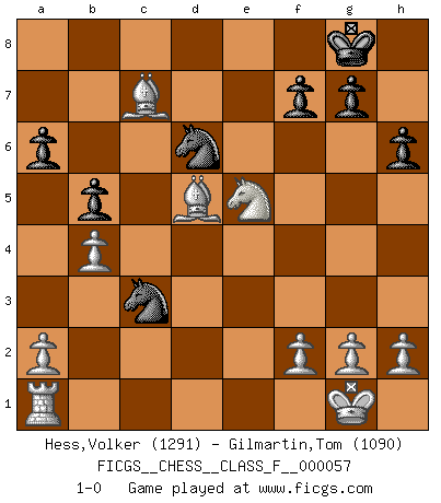 Last move : 1-0 2008 April 22 1:32:35 [Event "FICGS__CHESS__CLASS_F__000057"] [Site "FICGS"] [Date "2008.03.25"] [Round "1"] [White "Hess,Volker"] [Black "Gilmartin,Tom"] [Result "1-0"] [WhiteElo "1291"] [BlackElo "1090"] 1.e4 e5 2.Nf3 Nc6 3.Bb5 a6 4.Ba4 b5 5.Bb3 h6 6.c3 Nf6 7.Bc2 d5 8.d3 dxe4 9.dxe4 Bd6 10.O-O O-O 11.Re1 Bb7 12.Nbd2 Bc5 13.Nb3 Qe7 14.Nxc5 Qxc5 15.Be3 Qe7 16.b4 Na7 17.Bc5 Rfd8 18.Bxe7 Rxd1 19.Rexd1 Nxe4 20.Rd8+ Rxd8 21.Bxd8 Nxc3 22.Nxe5 Nc8 23.Bb3 Bd5 24.Bxd5 Nd6 25.Bxc7 1-0 Ruy Lopez : Caro variation Kingside Castling by player White (move 10) Kingside Castling by player Black (move 10) Player White won this chess game. Follow this game move after move (download)I am still a victim of Chess. It has all the beauty of art and much more. It cannot be commercialized. Chess is much purer than art in its social position. (Marcel Duchamp) Wenn ich mich einlogge, glauben die Leute gewöhnlich nicht, dass ich es selbst bin und sie fangen an, mir dumme Fragen zu stellen. Und wenn sie es glauben, stellen sie wieder andere dumme Fragen. (Judith Polgar) Creo que una cierta cantidad de temperamento es esperada de los genios del Ajedrez. (Ron Gross) Fischer est le meilleur joueur du monde et Karpov n'est qu'un joueur de bistrot. (Garry Kasparov, agé de 16 ans) The worth of a book is to be measured by what you can carry away from it. (James Bryce)