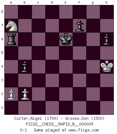Last move : 0-1 2006 September 5 23:2:16 [Event "FICGS__CHESS__RAPID_B__000009"] [Site "FICGS"] [Date "2006.07.11"] [Round "1"] [White "Colter,Nigel"] [Black "Groves,Don"] [Result "0-1"] [WhiteElo "1700"] [BlackElo "1500"] 1.e4 g6 2.d4 d6 3.c3 Bg7 4.Nf3 Nd7 5.Bd3 e6 6.O-O Ne7 7.Be3 b6 8.Na3 Bb7 9.Re1 h6 10.Qe2 g5 11.Nd2 Ng6 12.Ba6 Bxa6 13.Qxa6 O-O 14.Rad1 c6 15.Qe2 d5 16.f3 Qc7 17.c4 e5 18.Nb3 dxe4 19.fxe4 Nf6 20.dxe5 Nxe5 21.Bf2 Rad8 22.Nd4 Rfe8 23.Nf5 Rxd1 24.Rxd1 Ng6 25.Nd6 Nf4 26.Qc2 Re6 27.c5 Bf8 28.Nac4 b5 29.Ne3 Bxd6 30.cxd6 Qd7 31.Nf5 Rxe4 32.Ne7+ Kg7 33.h3 c5 34.Bxc5 Nxh3+ 35.Kh2 Qe6 36.Qc3 b4 37.Qf3 Qe5+ 38.Kh1 Qxc5 39.Nf5+ Kg6 40.gxh3 Rf4 41.Ne7+ Kg7 42.Qd3 Ne4 43.Qd4+ Qxd4 44.Rxd4 Ng3+ 45.Kg2 Rxd4 46.Kxg3 Kf6 47.Nc8 Ke6 48.Nxa7 Rxd6 49.h4 gxh4+ 50.Kxh4 Ra6 0-1 Robatsch (Modern) defense Kingside Castling by player White (move 6) Kingside Castling by player Black (move 13) 10 pieces endgame at move 49 : White KNPP , Black KRPPPP WHITE : King + 1 Knight 2 Pawns BLACK : King + 1 Rook 4 Pawns 9 pieces endgame at move 50 : White KNPP , Black KRPPP WHITE : King + 1 Knight 2 Pawns BLACK : King + 1 Rook 3 Pawns Player Black won this chess game. Follow this game move after move (download)You may learn much more from a game you lose than from a game you win. You will have to lose hundreds of games before becoming a good player. (Jose Raul Capablanca) Es gibt keine einzige Frau, der ich nicht einen Springer vorgeben könnte und trotzdem gewänne. (Robert James Fischer) Cuando le juegas a Fischer, no es una cuestion de si vas a ganar o perder. Es una cuestion de si vas a sobrevivir. (Boris Spassky) Même un GMI sait rarement calculer sur plus de cinq coups une attaque à sacrifices. (Rudolf Spielmann) Luck has a peculiar habit of favoring those who don't depend on it. (Author unknown)