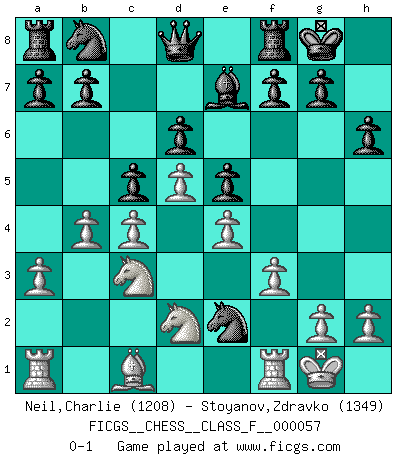 Last move : 0-1 2008 April 26 0:5:59 [Event "FICGS__CHESS__CLASS_F__000057"] [Site "FICGS"] [Date "2008.03.25"] [Round "1"] [White "Neil,Charlie"] [Black "Stoyanov,Zdravko"] [Result "0-1"] [WhiteElo "1208"] [BlackElo "1349"] 1.e4 c6 2.c4 e5 3.Nf3 d6 4.d4 Bg4 5.d5 c5 6.Be2 h6 7.Nc3 Nf6 8.Nd2 Bxe2 9.Qxe2 Be7 10.f3 O-O 11.O-O Nh5 12.a3 Nf4 13.b4 Nxe2+ 0-1 Caro-Kann : Anti-Caro-Kann defense Kingside Castling by player Black (move 10) Kingside Castling by player White (move 11) Player Black won this chess game. Follow this game move after move (download)The combination player thinks forward; he starts from the given position, and tries the forceful moves in his mind. (Emanuel Lasker) Es ist im Leben wie im Schachspiel. Wir entwerfen einen Plan, dieser bleibt jedoch bedingt durch das, was im Schachspiel dem Gegner, im Leben dem Schicksal zu tun belieben wird. (Arthur Schopenhauer) Tu sabes, camarada Pachman, no disfruto el ser un Ministro, preferería jugar al Ajedrez como tu. (Che Guevara) Avec des compensations pour le matériel en plus... (Anonyme) All battles are fought by scared men who'd rather be someplace else. (John Wayne in the movie In harm's way)