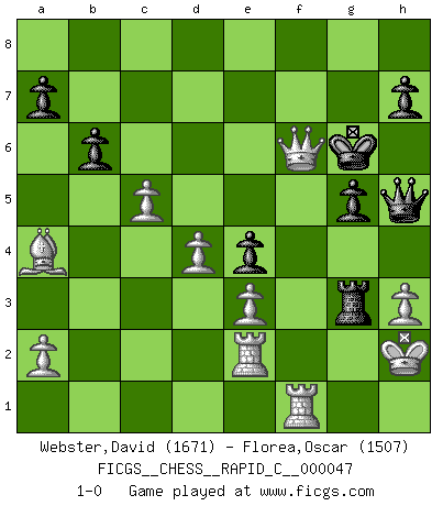 Last move : 1-0 2008 June 30 0:57:30 [Event "FICGS__CHESS__RAPID_C__000047"] [Site "FICGS"] [Date "2008.03.26"] [Round "1"] [White "Webster,David"] [Black "Florea,Oscar"] [Result "1-0"] [WhiteElo "1671"] [BlackElo "1507"] 1.d4 d5 2.c4 c6 3.Nf3 Nf6 4.e3 Bg4 5.Nc3 e6 6.h3 Bxf3 7.Qxf3 Bd6 8.c5 Bc7 9.Bd3 Nbd7 10.O-O e5 11.Bc2 O-O 12.Bd2 Re8 13.Rae1 e4 14.Qe2 b6 15.b4 Bb8 16.Qa6 Qc7 17.g3 Nh5 18.Re2 Re6 19.Be1 f5 20.b5 Rg6 21.bxc6 Qxc6 22.Ba4 Qc7 23.Nxd5 Qd8 24.Qb7 Nxg3 25.fxg3 Bxg3 26.Bxg3 Rxg3+ 27.Kh2 Qh4 28.Qxa8+ Nf8 29.Nf4 g5 30.Qd5+ Kg7 31.Qe5+ Kh6 32.Qxf5 Ng6 33.Nxg6 Qh5 34.Qf8+ Kxg6 35.Qf6+ 1-0 QGD Slav : 4.e3 Kingside Castling by player White (move 10) Kingside Castling by player Black (move 11) Player White won this chess game. Follow this game move after move (download)Chess is mental torture. (Garry Kasparov) Wir können eben der zündenden Macht des Opfers nicht wiederstehen, denn die Begeisterung für das Opfer liegt in der Natur des Menschen. (Rudolf Spielmann) El Ajedrez es un juego terrible. Si no dominas el centro, tu oponente tiene una posición mas libre. Si tu tienes el centro, entonces realmente tienes algo de que preocuparte. (Siegbert Tarrasch) Des points faibles ou des trous dans la position de l'adversaire doivent être occupés par des pièces et non pas par des pions. (Siegbert Tarrasch) As the days dwindle down... to a precious few. (Maxwell Anderson)