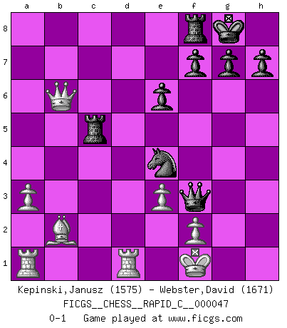 Last move : 0-1 2008 May 25 12:38:19 [Event "FICGS__CHESS__RAPID_C__000047"] [Site "FICGS"] [Date "2008.03.26"] [Round "1"] [White "Kepinski,Janusz"] [Black "Webster,David"] [Result "0-1"] [WhiteElo "1575"] [BlackElo "1671"] 1.Nf3 d5 2.e3 Nf6 3.c4 e6 4.a3 Bd6 5.Qc2 O-O 6.Be2 dxc4 7.Bxc4 Nbd7 8.O-O b6 9.Nc3 Bb7 10.d4 Bxf3 11.gxf3 c5 12.Nb5 Bxh2+ 13.Kxh2 a6 14.dxc5 axb5 15.Bxb5 Nxc5 16.b4 Qd5 17.bxc5 Rac8 18.Rd1 Qh5+ 19.Kg2 Rxc5 20.Qd3 Rg5+ 21.Kf1 Rd5 22.Qc2 Rxb5 23.Qc6 Rc5 24.Qxb6 Ne4 25.Bb2 Qxf3 0-1 Reti Opening Kingside Castling by player Black (move 5) Kingside Castling by player White (move 8) Player Black won this chess game. Follow this game move after move (download)Chess is a forcing house where the fruits of character can ripen more fully than in life. (Edward Morgan Foster) Ich könnte leicht behaupten: Ja,ja, Leonid Breschnew wollte nicht, daß ich Weltmeister werde. In der Tat war die Sache komplizierter. (Viktor Kortschnoi) El Ajedrez no es como la vida... ¡tiene reglas!. (Mark Pasternak) Assurément je connaissais par expérience le mystérieux attrait de ce jeu royal, le seul entre tous les jeux inventés par les hommes qui échappe souverainement à la tyrannie du hasard, le seul où l'on ne doive sa victoire qu'à son intelligence ou plutôt à une certaine forme d'intelligence. Mais n'est-ce pas déjà le limiter injurieusement que d'appeler les échecs un jeu ? N'est-ce pas une science, un art ou quelque chose qui, comme le cercueil de Mahomet entre ciel et terre, est suspendu entre l'un et l'autre, et qui réunit un nombre incroyable de contraires ? [...] C'est une pensée qui ne mène à rien, une mathématique qui n'établit rien, un art qui ne laisse pas d'uvre, une architecture sans matière; et il l'a prouvé néanmoins qu'il était plus durable, à sa manière, que les livres ou que tout autre monument, ce jeu unique qui appartient à tous les peuples et à tous les temps, et dont personne ne sait quel dieu en fit don à la terre pour tuer l'ennui, pour aiguiser l'esprit et stimuler l'âme. Où commence-t-il, où finit-il ? (Stefan Zweig) Internet: Absolute communication, absolute isolation. (Paul Carvel)