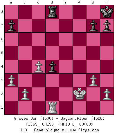 Last move : 1-0 2006 August 24 14:58:16 [Event "FICGS__CHESS__RAPID_B__000009"] [Site "FICGS"] [Date "2006.07.11"] [Round "1"] [White "Groves,Don"] [Black "Baycan,Alper"] [Result "1-0"] [WhiteElo "1500"] [BlackElo "1626"] 1.e4 c5 2.Nf3 Nc6 3.d3 e6 4.g3 d6 5.Bg2 Nf6 6.O-O Be7 7.Nbd2 O-O 8.Nc4 b5 9.Nxd6 Bxd6 10.e5 Nxe5 11.Nxe5 Nd5 12.f4 f6 13.Ng4 Rb8 14.Qe2 Re8 15.Bd2 Bb7 16.c4 bxc4 17.dxc4 Nb4 18.Bc3 Qe7 19.Bxb7 Rxb7 20.a3 Nc6 21.Rad1 e5 22.Qe4 Nd4 23.fxe5 fxe5 24.Qd5+ Kh8 25.Rde1 Rd7 26.Bxd4 cxd4 27.Nxe5 Bxe5 28.Rxe5 Rxd5 29.Rxe7 R5d8 30.Rxe8+ Rxe8 31.Rd1 Rd8 32.Kf2 1-0 Sicilian defense Kingside Castling by player White (move 6) Kingside Castling by player Black (move 7) Player White won this chess game. Follow this game move after move (download)Winning isn't everything... but losing is nothing. (Mednis) Obendrein hat der FIDE-Präsident den Revolutionsführer Gaddafi zum »Großmeister« ernannt, am Ende der WM. Das ist lächerlich! (Joel Lautier) Todo se encuentra en un estado de flujo y esto incluye al mundo del Ajedrez. (Mikhail Botvinnik) Un footballeur joue avec ses pieds, parfois avec sa tête. Un joueur d'échecs ne joue qu'avec sa tête. Et quand il ne joue plus, il meurt. (Jacob Murray) Kids, you tried your best and you failed miserably. The lesson is, never try. (Simpsons)