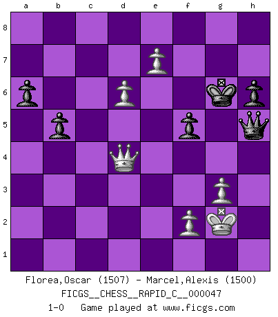 Last move : 1-0 2008 April 16 16:48:11 [Event "FICGS__CHESS__RAPID_C__000047"] [Site "FICGS"] [Date "2008.03.26"] [Round "1"] [White "Florea,Oscar"] [Black "Marcel,Alexis"] [Result "1-0"] [WhiteElo "1507"] [BlackElo "1500"] 1.d4 d5 2.c4 dxc4 3.Nf3 Nf6 4.e3 e6 5.Bxc4 Be7 6.Nc3 O-O 7.O-O Nc6 8.e4 a6 9.a4 Bd7 10.Re1 Na7 11.h3 Qe8 12.e5 Nd5 13.Nxd5 exd5 14.Bxd5 c6 15.Bb3 Bb4 16.Bd2 Bxd2 17.Qxd2 b5 18.Qd3 h6 19.Bc2 g6 20.h4 Nc8 21.h5 Bf5 22.Qd2 Bxc2 23.Qxc2 Kg7 24.axb5 cxb5 25.Qe4 Ne7 26.e6 f5 27.Qe5+ Kh7 28.hxg6+ Qxg6 29.Rac1 Rg8 30.Nh4 Qg5 31.g3 Qxh4 32.Rc7 Qg5 33.Kf1 Rac8 34.d5 Rxc7 35.Qxc7 Rc8 36.Qb7 Kg6 37.d6 Rc1 38.Qxe7 Rxe1+ 39.Kxe1 Qc1+ 40.Ke2 Qxb2+ 41.Kf3 Qc3+ 42.Kg2 Qc6+ 43.Kh2 Qf3 44.Qf7+ Kg5 45.Qg7+ Kh5 46.Qf7+ Kg5 47.Qg7+ Kh5 48.Qd4 Kg6 49.e7 Qh5+ 50.Kg2 1-0 QGA : 4...e6 Kingside Castling by player Black (move 6) Kingside Castling by player White (move 7) Player White won this chess game. Follow this game move after move (download)Personally, I rather look forward to a computer program winning the world Chess Championship. Humanity needs a lesson in humility. (Richard Dawkings) Im Internet Chess Club betrug mein Rating vorübergehend 3350 ELO-Punkte. (Sergej Karjakin) El Ajedrez es una manera fabulosa para que los niños aprendan a autovalorarse y a autoestimarse. (Saudin Robovic) Celui qui prend des risques peut perdre, celui qui n'en prend pas perd toujours. (Xavier Tartacover) Remember : Your focus determines your reality. (Qui-Gon Jinn in Star Wars ep.1)