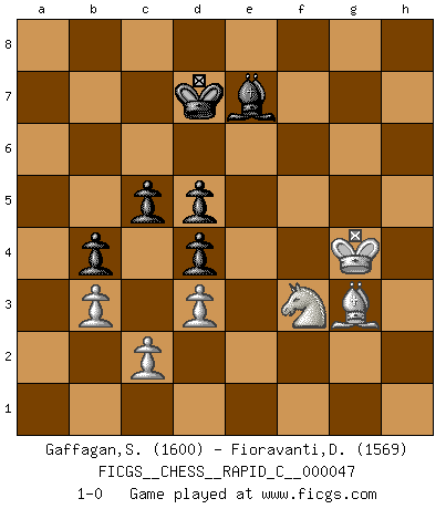 Last move : 1-0 2008 September 10 20:53:30 [Event "FICGS__CHESS__RAPID_C__000047"] [Site "FICGS"] [Date "2008.03.26"] [Round "1"] [White "Gaffagan,Steven"] [Black "Fioravanti,Diego"] [Result "1-0"] [WhiteElo "1600"] [BlackElo "1569"] 1.e4 Nc6 2.Nf3 e5 3.Bb5 Nd4 4.Nxd4 exd4 5.Bc4 Nf6 6.O-O Nxe4 7.Bxf7+ Kxf7 8.Qh5+ g6 9.Qd5+ Kg7 10.Qxe4 Qf6 11.d3 c6 12.Bf4 d6 13.Nd2 Bf5 14.Qf3 g5 15.Bg3 h5 16.Rae1 Qg6 17.h4 gxh4 18.Bxh4 Qg4 19.Bg3 h4 20.Qxg4+ Bxg4 21.Re4 Bf5 22.Rxh4 Rxh4 23.Bxh4 Re8 24.f3 d5 25.Kf2 Kg6 26.g4 Bd7 27.Re1 Rxe1 28.Kxe1 c5 29.Bg3 a5 30.Nf1 b5 31.Nh2 a4 32.f4 Bc8 33.f5+ Kg5 34.Kf2 Be7 35.Be5 Kh4 36.Kg2 b4 37.b3 axb3 38.axb3 Kg5 39.Kg3 Bxf5 40.Nf3+ Kg6 41.gxf5+ Kxf5 42.Bc7 Ke6 43.Kg4 Kd7 44.Bg3 1-0 KP : Nimzovich defense Kingside Castling by player White (move 6) Player White won this chess game. Follow this game move after move (download)Good positions don't win games, good moves do. (Gerald Abrahams) Modernes Schach erfordert enorme Anspannung. Es ist für einen normalen Menschen unmöglich das auszuhalten. (Viktor Kortschnoi) Con el tiempo, empecé a progresar en partidas decisivas. Tal vez porque me di cuenta de una simple verdad: no solo estaba yo nervioso sino también mi oponente. (Mikhail Tal) En blitz, le Cavalier l'emporte sur le Fou. (Vlastimil Hort) Inventor: A person who makes an ingenious arrangement of wheels, levers and springs, and believes it civilization. (Ambrose Bierce, The Devil's Dictionary)