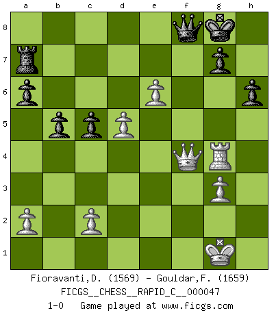 Last move : 1-0 2008 May 19 21:15:40 [Event "FICGS__CHESS__RAPID_C__000047"] [Site "FICGS"] [Date "2008.03.26"] [Round "1"] [White "Fioravanti,Diego"] [Black "Gouldar,Frances"] [Result "1-0"] [WhiteElo "1569"] [BlackElo "1659"] 1.Nc3 Nf6 2.e4 e5 3.g3 Nc6 4.Nf3 Bc5 5.Bg2 O-O 6.Nxe5 Bxf2+ 7.Kxf2 Nxe5 8.d4 Ng6 9.Rf1 d6 10.Kg1 Bg4 11.Qd3 h6 12.Be3 Re8 13.Rf2 Be6 14.h3 a6 15.Raf1 Nh7 16.h4 c6 17.h5 Ne7 18.d5 Bg4 19.Rxf7 Bxh5 20.R7f2 c5 21.e5 Ng6 22.e6 Ne5 23.Qd2 Ng4 24.Rf4 Nxe3 25.Qxe3 b5 26.Rh4 Bg6 27.Be4 Bxe4 28.Nxe4 Ra7 29.b4 Ng5 30.Rg4 Nxe4 31.Qxe4 Rf8 32.Rxf8+ Qxf8 33.bxc5 dxc5 34.Qf4 1-0 Dunst (Sleipner, Heinrichsen) Opening Kingside Castling by player Black (move 5) Player White won this chess game. Follow this game move after move (download)The tactician must know what to do whenever something needs doing; the strategist must know what to do when nothing needs doing. (Savielly Tartakover) Du musst nicht gut spielen, es reicht, wenn du besser spielst als dein Gegner. (Anonymous) Todos los Maestros de Ajedrez fueron un día unos principiantes. (Chernev) Les Echecs ne sont pas pour les âmes timides. Ils requièrent un homme entier, qui ne s'arrête pas aveuglément à ce qui a été déjà établi, mais qui tente individuellement de sonder les profondeurs du jeu. (W. Steinitz) Horse racing is animated roulette. (Roger Kahn)