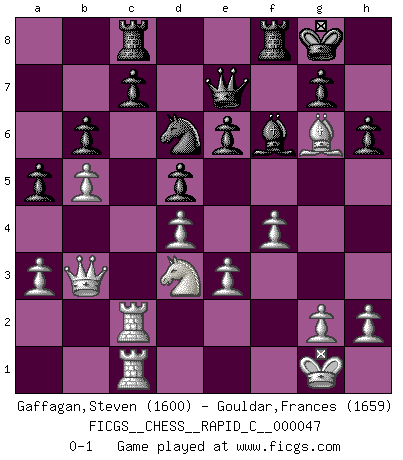 Last move : 0-1 2008 June 17 12:35:42 [Event "FICGS__CHESS__RAPID_C__000047"] [Site "FICGS"] [Date "2008.03.26"] [Round "1"] [White "Gaffagan,Steven"] [Black "Gouldar,Frances"] [Result "0-1"] [WhiteElo "1600"] [BlackElo "1659"] 1.c4 e6 2.Nc3 d5 3.d4 Nf6 4.cxd5 exd5 5.Bg5 Be7 6.e3 O-O 7.Bd3 h6 8.Bf4 Nc6 9.Nge2 Be6 10.a3 Nh5 11.Qc2 Nxf4 12.Nxf4 Qd7 13.O-O Bf6 14.b4 a6 15.Rfc1 Rfe8 16.Na4 Qd6 17.Nxe6 fxe6 18.Nc5 Nd8 19.f4 a5 20.b5 Rc8 21.Bg6 Rf8 22.Nd3 b6 23.Qb3 Qe7 24.Ra2 Nb7 25.Rac2 Nd6 0-1 This chess game has been lost on time (started : 2008.03.26 14:55:17) English Opening Kingside Castling by player Black (move 6) Kingside Castling by player White (move 13) Player Black won this chess game. Follow this game move after move (download)I look one move ahead... the best ! (Siegbert Tarrasch) Ich rechne überhaupt nicht voraus. Ich gewinne auch so. (Robert James Fischer) Muchos jugadores de Ajedrez se sorprendían cuando después de la partida, Fischer explicaba con calma: 'Yo ya había analizado esta posibilidad' en una posición en la cual yo creía que no era posible de prever desde la apertura. (Mikhail Tal) Aidez vos pièces, elles vous aideront. (Paul Morphy) Beta. Software undergoes beta testing shortly before it's released. Beta is latin for still doesn't work. (Anonymous)