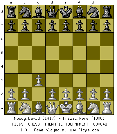 Last move : 1-0 2008 May 8 21:28:41 [Event "FICGS__CHESS__THEMATIC_TOURNAMENT__000048"] [Site "FICGS"] [Date "2008.03.29"] [Round "1"] [White "Moody,David"] [Black "Prizac,Rene"] [Result "1-0"] [WhiteElo "1417"] [BlackElo "1800"] 1.c3 1-0 This chess game has been lost on time (started : 2008.03.29 10:49:36) Saragossa Opening Player White won this chess game. Follow this game move after move (download)In a gambit you give up a Pawn for the sake of getting a lost game. (Samuel Standige Boden) Es ist wirklich schade, dass so viele Schachspieler nicht auf ihr Äußeres achten! (Alexandra Kosteniuk) Para mi, el Ajedrez es la vida y cada partida es como una nueva vida. Todo jugador de Ajedrez suele vivir muchas vidas durante su vida. (Eduard Gufeld) Des points faibles ou des trous dans la position de l'adversaire doivent être occupés par des pièces et non pas par des pions. (Siegbert Tarrasch) The difference between stupidity and genius is that genius has its limits. (Murphy)