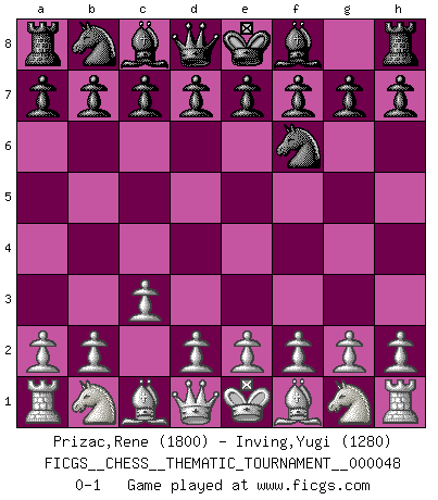 Last move : 0-1 2008 May 8 21:28:41 [Event "FICGS__CHESS__THEMATIC_TOURNAMENT__000048"] [Site "FICGS"] [Date "2008.03.29"] [Round "1"] [White "Prizac,Rene"] [Black "Inving,Yugi"] [Result "0-1"] [WhiteElo "1800"] [BlackElo "1280"] 1.c3 Nf6 0-1 This chess game has been lost on time (started : 2008.03.29 10:49:36) Saragossa Opening Player Black won this chess game. Follow this game move after move (download)Capture of the adverse King is the ultimate but not the first object of the game. (William Steinitz) Die Fehler sind da, Sie warten nur darauf gemacht zu werden. (Savielly Grigorievitsch Tartakower) En el Ajedrez, cuando menos, el valiente hereda la tierra. (Edmar Mednis) Les Echecs sont affaire de jugement sensible. Savoir quand frapper et quand esquiver. (Fischer) Every vice is only an exaggeration of a necessary and virtuous function. (Ralph Waldo Emerson, Journals 1936)