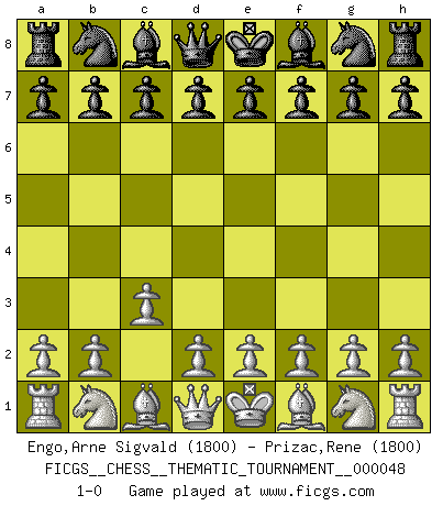 Last move : 1-0 2008 May 8 21:28:41 [Event "FICGS__CHESS__THEMATIC_TOURNAMENT__000048"] [Site "FICGS"] [Date "2008.03.29"] [Round "1"] [White "Engo,Arne Sigvald"] [Black "Prizac,Rene"] [Result "1-0"] [WhiteElo "1800"] [BlackElo "1800"] 1.c3 1-0 This chess game has been lost on time (started : 2008.03.29 10:49:36) Saragossa Opening Player White won this chess game. Follow this game move after move (download)If your opponent cannot do anything active, then don't rush the position; instead you should let him sit there, suffer, and beg you for a draw. (Jeremy Silman) Ich bin der einzige Schachspieler, der sich während der Vorbereitungen zum Turnier verletzt hat. (Woody Allen) El Ajedrez es 99 por ciento táctica. (Teichmann) Toutes les manuvres exécutées sur une colonne ouverte ont pour but ultime l'intrusion définitive sur la septième ou la huitième rangée, en plein cur de la position ennemie. (Aaron Nimzovitch) Those who make the worst use of their time are the first to complain of its brevity. (Jean de la Bruyere)