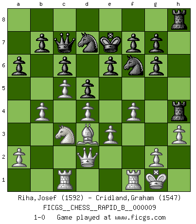 Last move : 1-0 2006 August 28 18:53:12 [Event "FICGS__CHESS__RAPID_B__000009"] [Site "FICGS"] [Date "2006.07.11"] [Round "1"] [White "Riha,Josef"] [Black "Cridland,Graham"] [Result "1-0"] [WhiteElo "1592"] [BlackElo "1547"] 1.d4 Nf6 2.c4 c6 3.Nf3 d5 4.Nc3 a6 5.c5 Bf5 6.Bf4 Nbd7 7.e3 e6 8.Be2 Be7 9.O-O Qc8 10.Nh4 Bg6 11.Rc1 Bd8 12.Nxg6 hxg6 13.Bd3 Bc7 14.Bxc7 Qxc7 15.f4 Ke7 16.b4 Rh4 17.Qd2 Rah8 18.h3 1-0 This chess game has been lost on time (started : 2006.07.11 13:21:13) Queen's pawn game Kingside Castling by player White (move 9) Player White won this chess game. Follow this game move after move (download)When in doubt... play Chess ! (Tevis) Bogoljubow: Matt in vier Zügen! Tartakower: Ich verbitte mir jede Belästigung! (Savielly Grigorievitsch Tartakower) Muchos se han convertido en Maestros de Ajedrez, nadie se ha convertido en el Maestro del Ajedrez. (Siegbert Tarrasch) Je fais ceci parce que dans cinquante coups j'obtiendrai cela; je m'appelle Mikhail Moisevitch Botvinnik. (Botvinnik) Whatever you do, don't be bored. This is absolutely the most exciting time we could have possibly hoped to be alive. And things are just starting. (From movie Waking life)