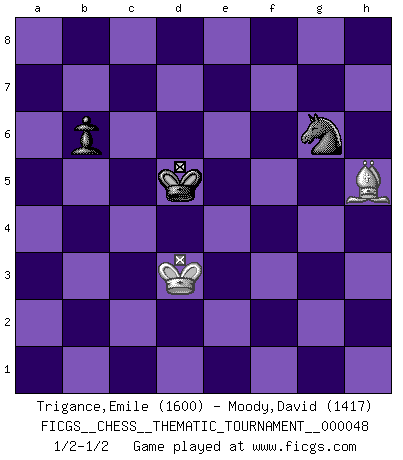 Last move : 1/2-1/2 2008 June 24 6:50:43 [Event "FICGS__CHESS__THEMATIC_TOURNAMENT__000048"] [Site "FICGS"] [Date "2008.03.29"] [Round "1"] [White "Trigance,Emile"] [Black "Moody,David"] [Result "1/2-1/2"] [WhiteElo "1600"] [BlackElo "1417"] 1.c3 b6 2.Nf3 Bb7 3.d3 Bxf3 4.exf3 e6 5.g3 Nf6 6.Bg2 d5 7.f4 Nbd7 8.O-O c5 9.Qe2 Be7 10.Nd2 Rc8 11.Nf3 O-O 12.Re1 c4 13.dxc4 Rxc4 14.f5 Re4 15.Qd2 exf5 16.Rxe4 dxe4 17.Nd4 Ne5 18.Nxf5 Bc5 19.Qe2 Qd3 20.Kf1 Rd8 21.Be3 Bxe3 22.Nxe3 Qd2 23.Qxd2 Rxd2 24.Rd1 Rxd1+ 25.Nxd1 Kf8 26.Ke2 Ke7 27.Ne3 g6 28.b3 Kd6 29.h3 Nd5 30.Nxd5 Kxd5 31.Ke3 f5 32.c4+ Kc5 33.a3 a5 34.Bf1 Kd6 35.Be2 Kc5 36.h4 h5 37.Bd1 Nd3 38.f3 a4 39.fxe4 fxe4 40.Bc2 axb3 41.Bxb3 Ne5 42.Kxe4 Nxc4 43.Kd3 Nxa3 44.Bf7 Nb5 45.Bxg6 Nd6 46.Bxh5 Nf5 47.g4 Nxh4 48.g5 Kd5 49.g6 Nxg6 1/2-1/2 Saragossa Opening Kingside Castling by player White (move 8) Kingside Castling by player Black (move 11) 10 pieces endgame at move 42 : White KBPPP , Black KNPPP WHITE : King + 1 Bishop 3 Pawns BLACK : King + 1 Knight 3 Pawns 9 pieces endgame at move 43 : White KBPP , Black KNPPP WHITE : King + 1 Bishop 2 Pawns BLACK : King + 1 Knight 3 Pawns 8 pieces endgame at move 45 : White KBPP , Black KNPP WHITE : King + 1 Bishop 2 Pawns BLACK : King + 1 Knight 2 Pawns 7 pieces endgame at move 46 : White KBPP , Black KNP WHITE : King + 1 Bishop 2 Pawns BLACK : King + 1 Knight 1 Pawn 6 pieces endgame at move 47 : White KBP , Black KNP WHITE : King + 1 Bishop 1 Pawn BLACK : King + 1 Knight 1 Pawn 5 pieces endgame at move 49 : White KB , Black KNP WHITE : King + 1 Bishop BLACK : King + 1 Knight 1 Pawn This chess game ended in a draw. Follow this game move after move (download)Only the player with the initiative has the right to attack. (Wilhelm Steinitz) Der Bart als Geschlechtszeichen mitten im Gesicht ist obszön. Daher gefällt er den Weibern. [Zugegeben, kein Schachzitat, aber unglaublich originell] (Arthur Schopenhauer) El juego de Damas es para vagabundos. (Paul Morphy) Lorsque vous vous retrouvez devant une position atroce, ne tendez pas un ultime piège dérisoire avec l'intention d'abandonner si l'adversaire le déjoue ! Faites-vous plutôt un devoir de résister comme si votre vie en dépendait. Jouez le coup qui vous déplairait au centuple si vous étiez dans la peau de votre tortionnaire ! Luck never made a man wise. (Seneca, Letters to Lucilius)