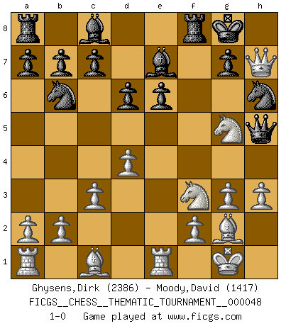 Last move : 1-0 2008 April 5 1:11:33 [Event "FICGS__CHESS__THEMATIC_TOURNAMENT__000048"] [Site "FICGS"] [Date "2008.03.29"] [Round "1"] [White "Ghysens,Dirk"] [Black "Moody,David"] [Result "1-0"] [WhiteElo "2386"] [BlackElo "1417"] 1.c3 f5 2.Nf3 Nf6 3.g3 e6 4.Bg2 Be7 5.O-O O-O 6.d4 d6 7.Nbd2 Nbd7 8.Qc2 Qe8 9.e4 fxe4 10.Nxe4 Qh5 11.Neg5 Nb6 12.Re1 Ng4 13.h3 Nh6 14.Qxh7+ 1-0 Saragossa Opening Kingside Castling by player White (move 5) Kingside Castling by player Black (move 5) Player White won this chess game. Follow this game move after move (download)I had a toothache during the first game. In the second game I had a headache. In the third game it was an attack of rheumatism. In the fourth game, I wasn't feeling well. And in the fifth game? Well, must one have to win every game ? (Siegbert Tarrasch) Über Kasparov: Es ist offensichtlich, daß er in einem totalitären Staat aufwuchs und deshalb zu diktatorischen Zügen neigt. (Viktor Kortschnoi) Siempre es mucho mejor sacrificar las piezas de tu oponente. (Savielly Tartakover) Horreur, mais aussi harmonie suprême : qu'y avait-il en effet au monde en dehors des échecs ? Le brouillard, l'inconnu, le non-être... (Vladimir Nabokov) It's unlucky to be superstitious. (Dave Enteles)