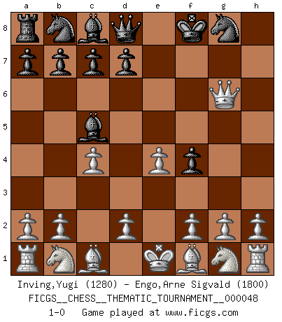 Last move : 1-0 2008 April 5 11:54:51 [Event "FICGS__CHESS__THEMATIC_TOURNAMENT__000048"] [Site "FICGS"] [Date "2008.03.29"] [Round "1"] [White "Inving,Yugi"] [Black "Engo,Arne Sigvald"] [Result "1-0"] [WhiteElo "1280"] [BlackElo "1800"] 1.c3 f5 2.c4 e5 3.e4 f4 4.Qh5+ Ke7 5.Qxe5+ Kf7 6.Qd5+ Ke8 7.Qh5+ g6 8.Qe5+ Be7 9.Qxh8 Kf8 10.Qxh7 Bc5 11.Qxg6 1-0 Saragossa Opening Player White won this chess game. Follow this game move after move (download)Chess is a beautiful mistress. (Bent Larsen) Schachspieler können ausgezeichnet Varianten am Schachbrett berechnen, aber nicht im realen Leben. Zu stark ist der Individualismus im Schach ausgeprägt, und für viele ist ein kleiner momentaner persönlicher Vorteil wichtiger als ein weit größerer Vorteil von morgen. (Anatoly Karpov) El Ajedrez era la lengua materna de Capablanca. (Reti) Fischer est le meilleur joueur du monde et Karpov n'est qu'un joueur de bistrot. (Garry Kasparov, agé de 16 ans) May the force be with you. (Han Solo in Star Wars ep.4)